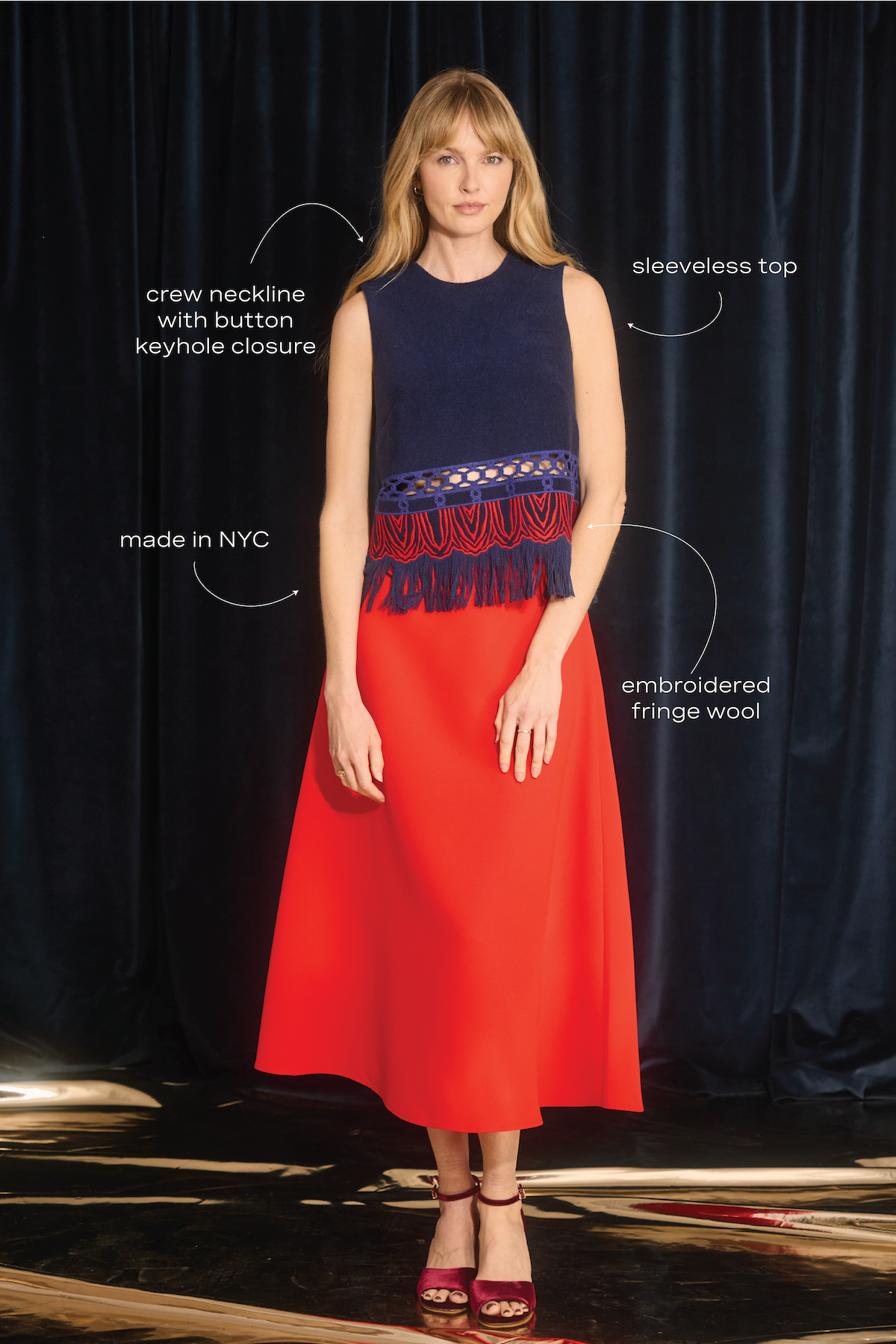 The Astor Top in Midnight Wool is a refined statement piece with artisanal detail. Crafted from Italian wool, it is accented with cutout trim, contrast embroidery, and a touch of fringe that adds subtle texture. Designed with a crew neckline, invisible zipper closure, and sleeveless silhouette, it delivers a look that is polished yet playful. Style it with the Rivington Skirt for a striking matching set or pair it with winter white pants for a modern take on holiday dressing. Proudly made in NYC.