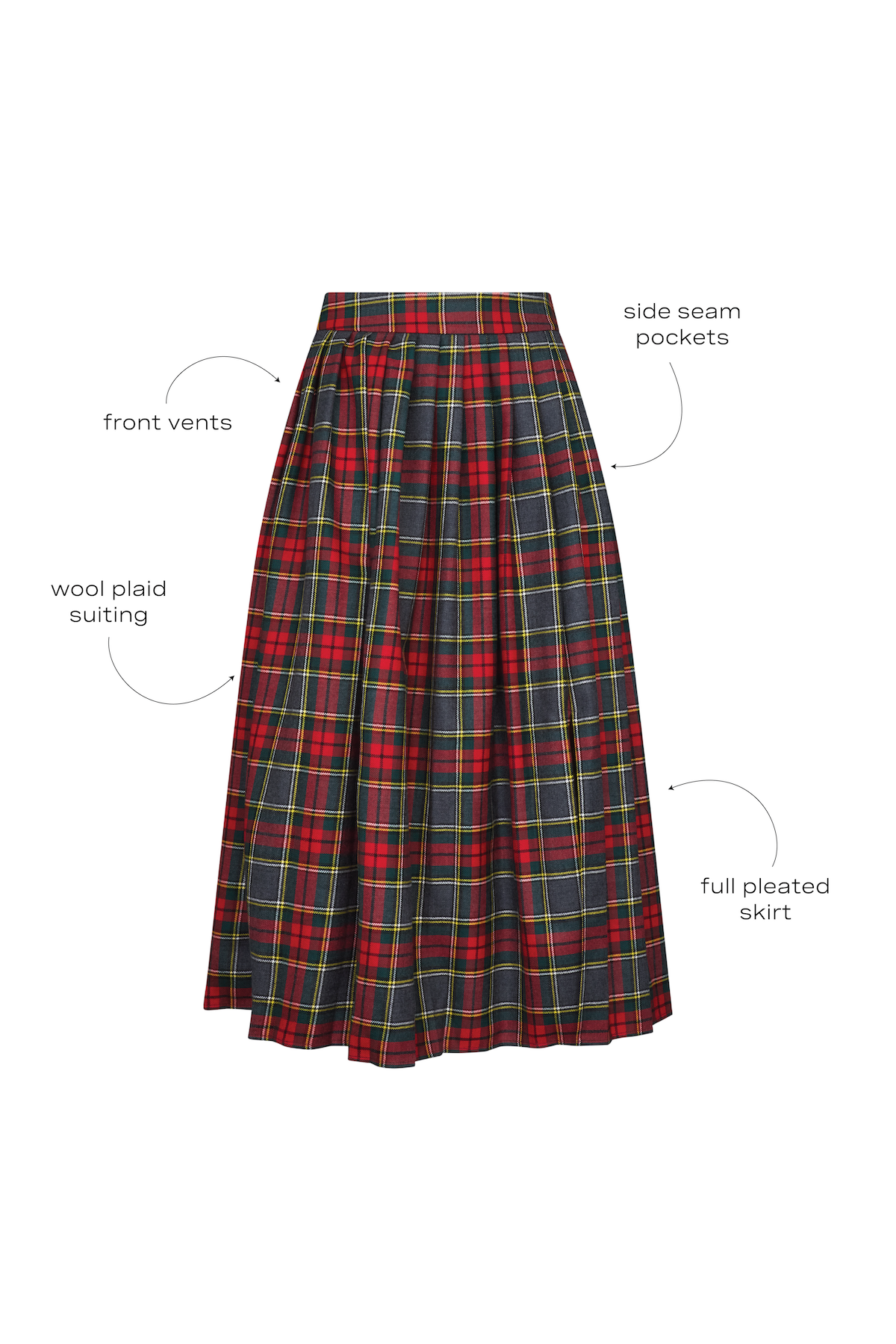 The Dominic Skirt returns for the holiday season in bold Bemelmans Plaid, bringing a modern twist to a timeless classic. Designed with a banded waist and a straight pleated silhouette finished with front slits, it strikes the perfect balance of structure and movement. Both fresh and unexpected, this reimagined tartan makes a statement while remaining endlessly versatile. Style it with the Doering Top for the ultimate holiday pairing, or dress it down with the Jennie Sweatshirt or Pixie Top for a more playful approach.