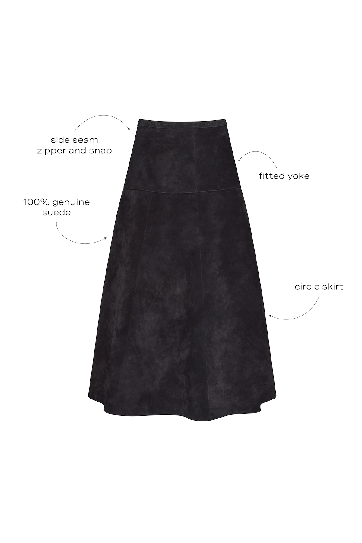 The Ida Skirt epitomizes timeless sophistication, crafted from sumptuous 100% genuine suede. Designed to be fitted at the waist and gracefully relaxed through the hips, it flows into a full, elegant skirt. Its versatile design makes it a perfect match for many Hunter Bell tops, establishing it as a staple in your wardrobe that seamlessly complements a variety of looks. Pair it with the Murphey Jacket for sophisticated monochramatic look.