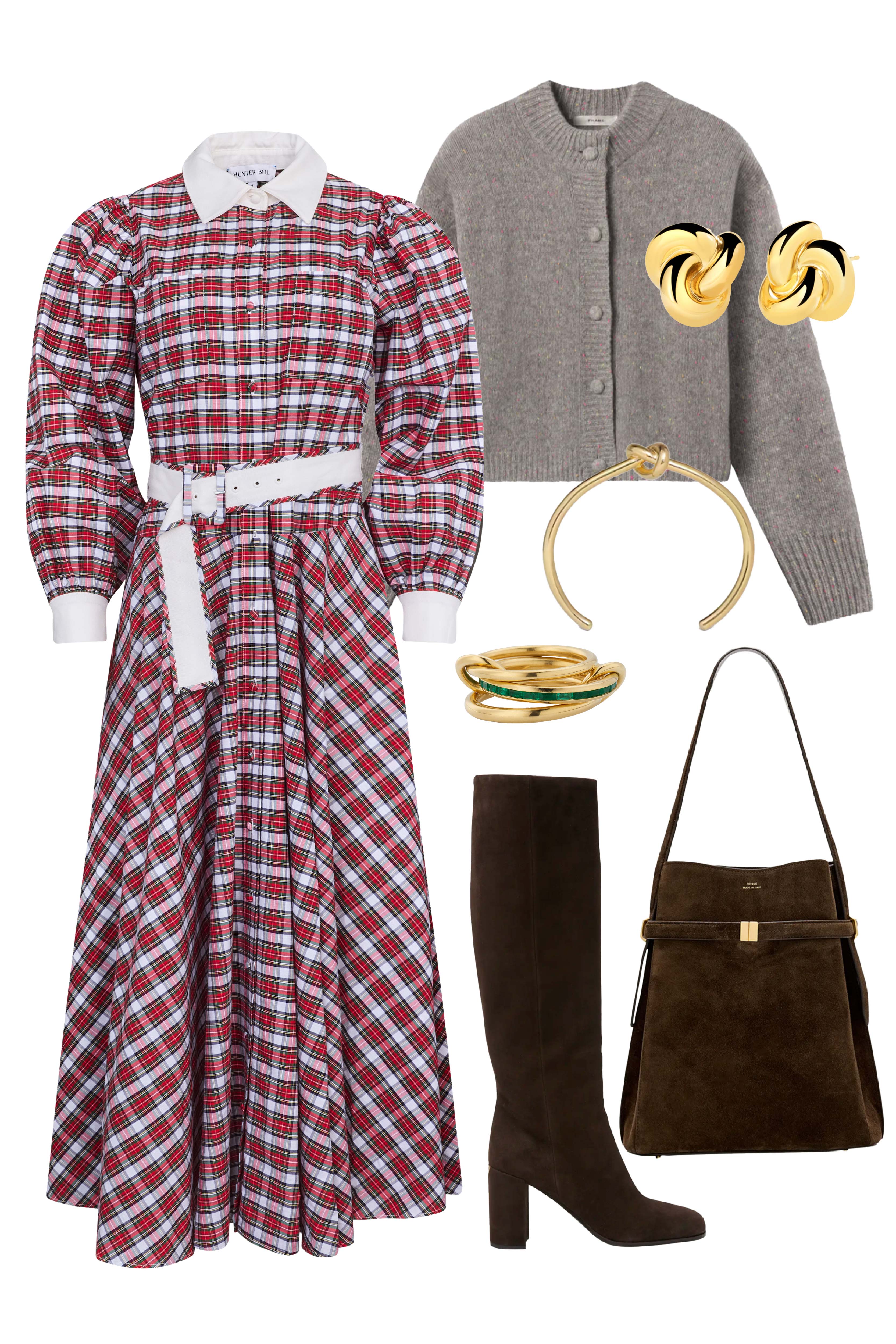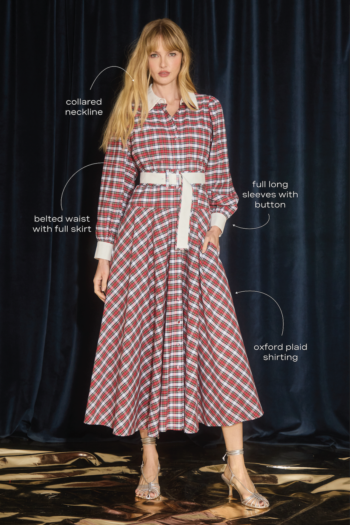 The Randolph Dress is a shirtdress with star power, designed to turn heads this holiday season and beyond. Cut in bold Alpine Plaid, it marries crisp tailoring with fluid movement. A sunburst circle skirt flares dramatically with every step, while full length voluminous sleeves with button cuffs keep the silhouette refined. The optional belt, crafted in white cotton faille and edged with plaid piping, is finished with a plaid wrapped buckle and grommets to cinch the waist and define the shape. Complete with a center front button placket, Randolph is a polished, season spanning staple destined to be worn on repeat.