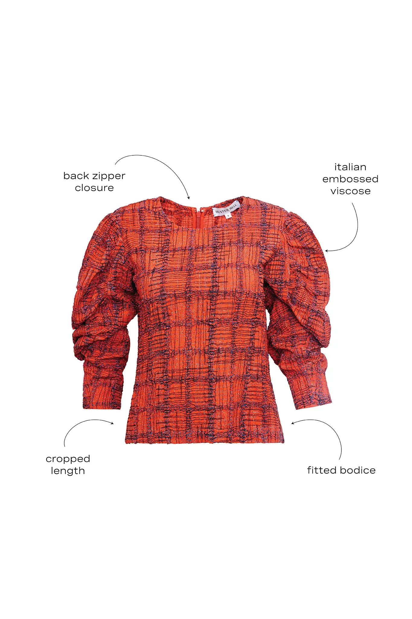 The Natalie Top is a striking silhouette that plays beautifully with volume and texture. Crafted from Italian embossed viscose woven with a subtle metallic thread, it features a cropped crew neckline and an elegantly fitted bodice balanced by dramatically full sleeves. A back zipper closure keeps the finish clean and refined. We love it styled with our navy faux leather Mabel Pants for a bold, modern pairing that still feels effortlessly polished.