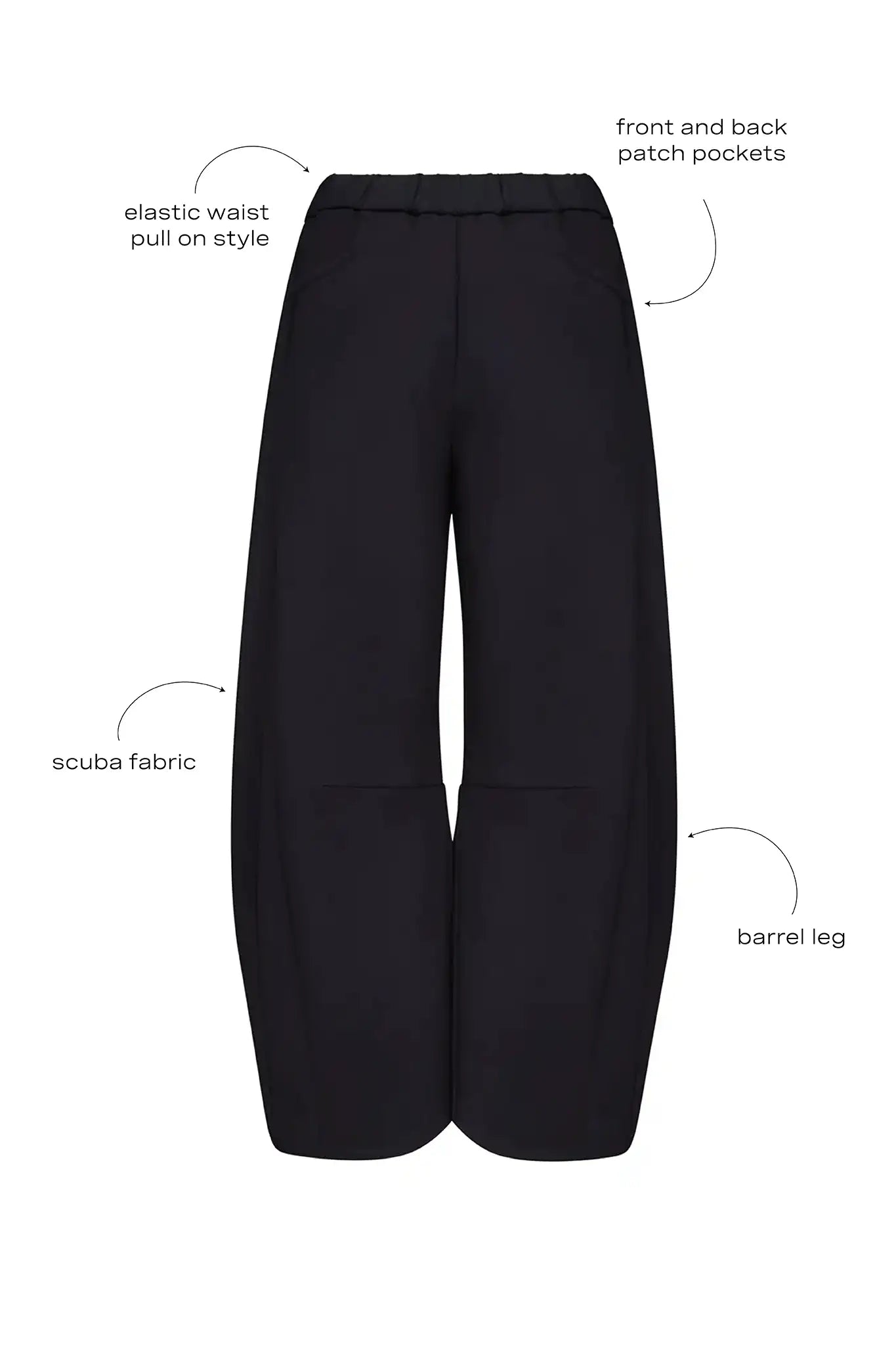 Duvall reimagines the classic five-pocket jean in fashion-forward scuba. Cut in Onyx, the pant holds a modern barrel-leg shape elastic waist pull on style with structure and ease. Front and back patch pocket construction nods to denim heritage while the sleek scuba fabric sharpens the silhouette. Pair back to the Jennie Sweatshirt for a completed set that’s casual and chic or the Doering Top for a more elevated look.