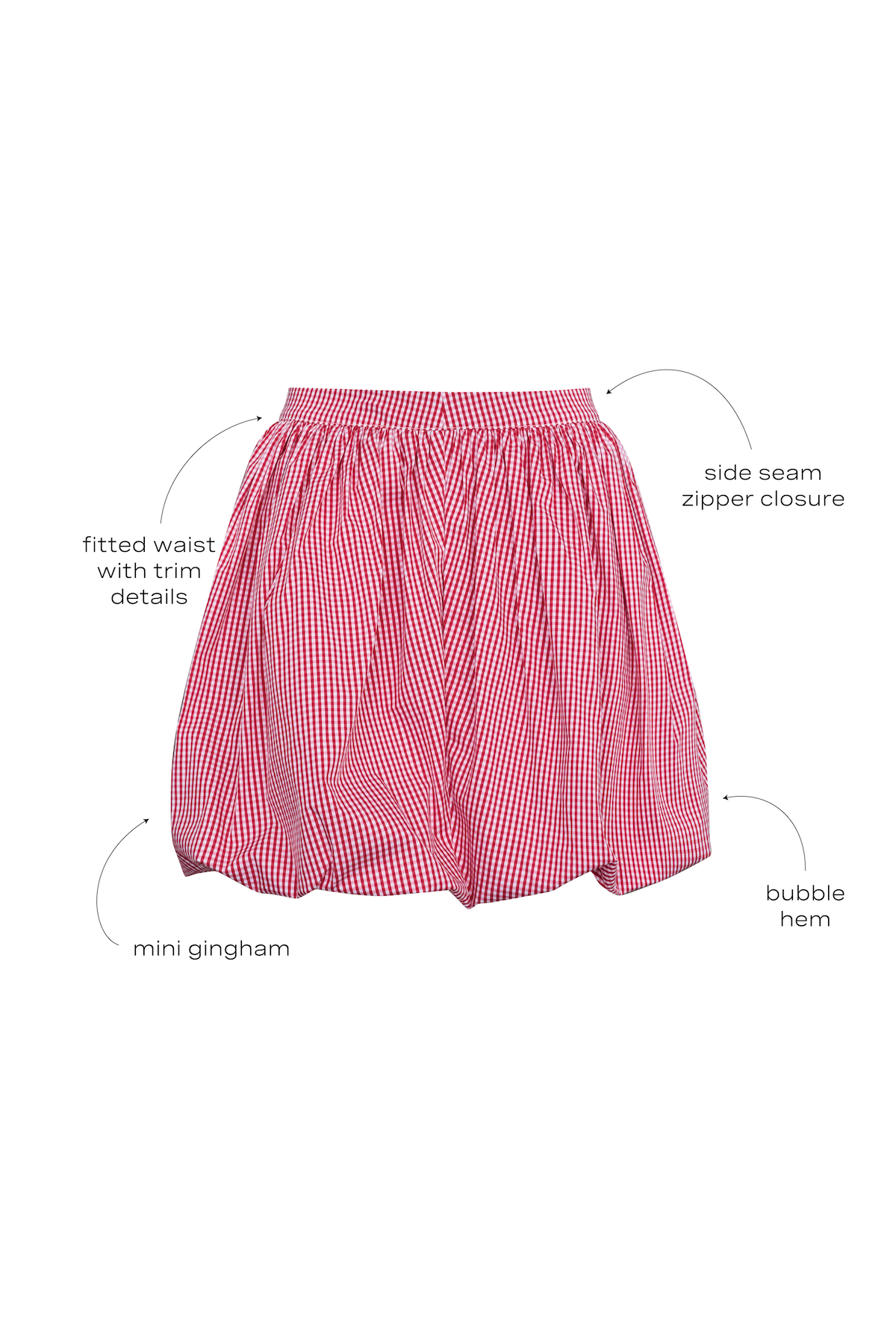 The Kinsley Skirt is a flirty bubble mini in our Carmine Check, a classic gingham updated with a modern twist and a touch of stretch for a smooth, comfortable fit. A trim traced fitted waist defines the silhouette, while the bubble hem creates playful volume and movement. Effortless and fun yet undeniably polished, Kinsley is a statement piece that captures the Hunter Bell spirit. Style it with the Mae Top for a coordinated set or pair it with the Doering Top in bright white for an instant pop of holiday contrast.
