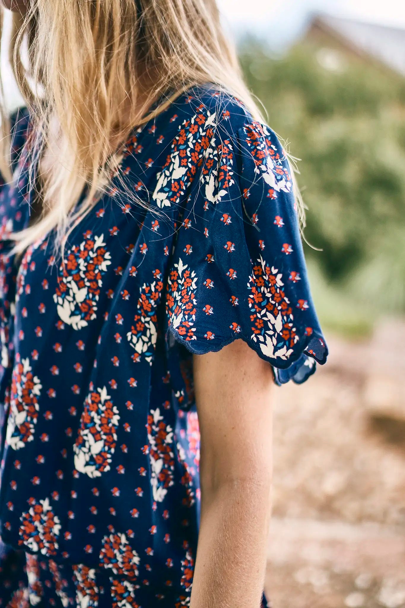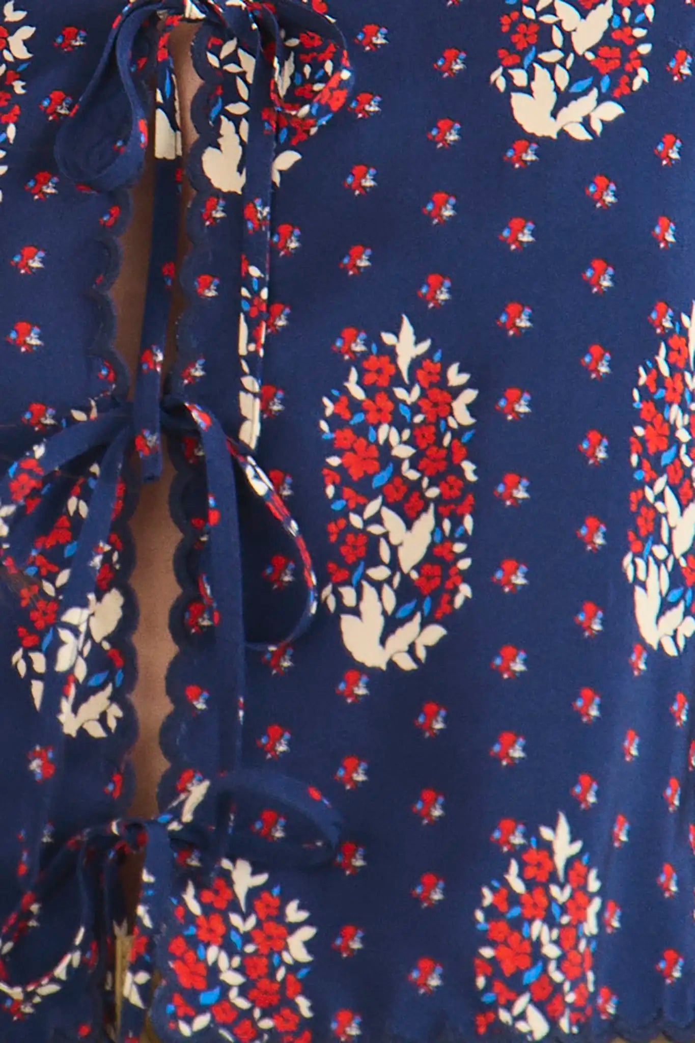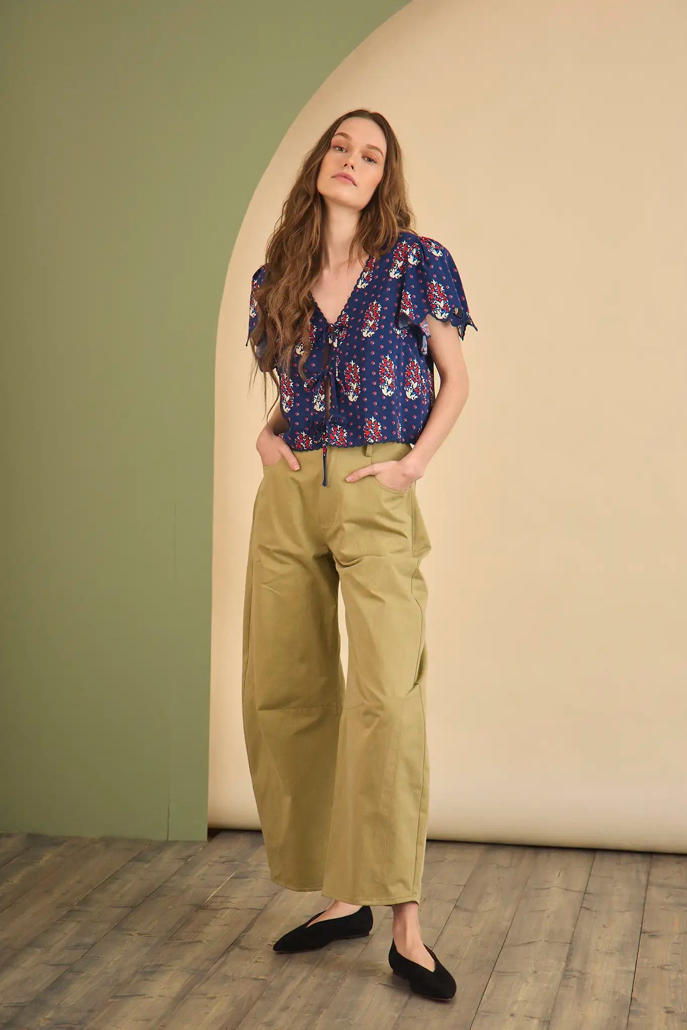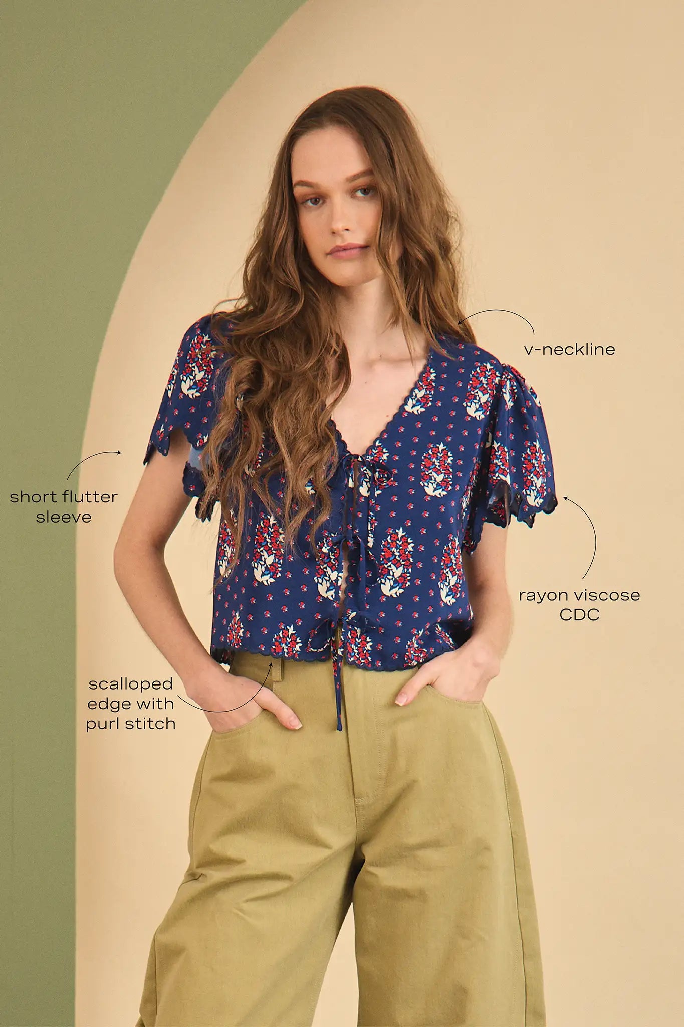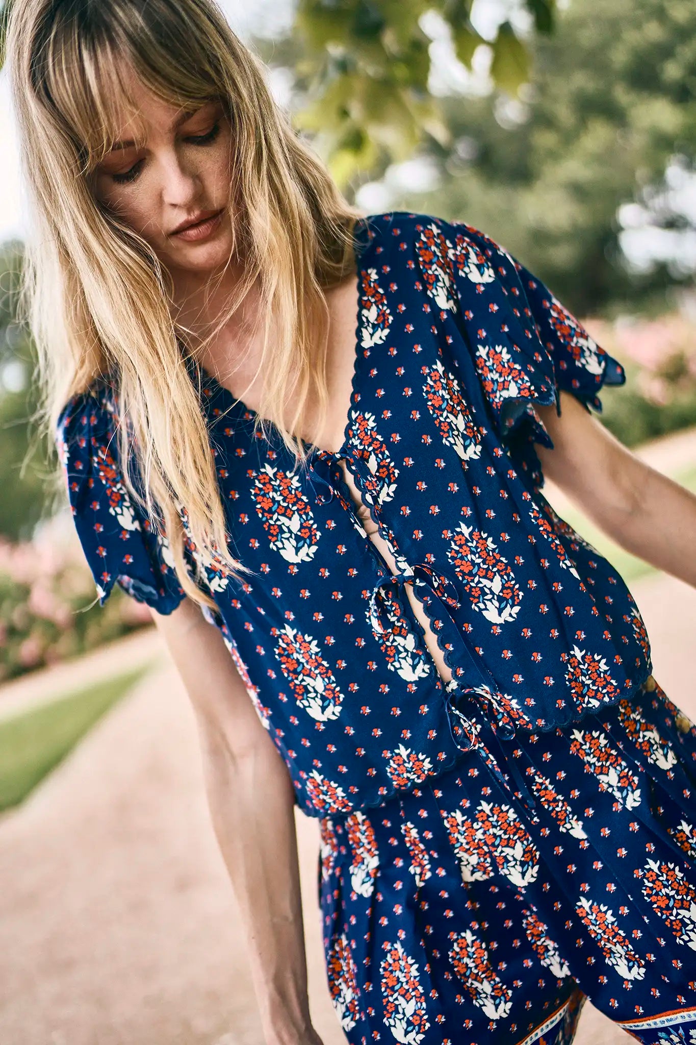 The Bardot Top brings a touch of vintage romance to your wardrobe, no matter the season. This cropped tie-front blouse is full of charming details, from the soft V-neckline and flutter sleeves to the scalloped edges finished with a delicate purl stitch. Designed in a relaxed, easy silhouette, it pairs beautifully with everything from high-rise denim to your favorite skirt. For a full matching set, style it with our Willa Shorts for a look that's playful, polished, and perfectly put together.