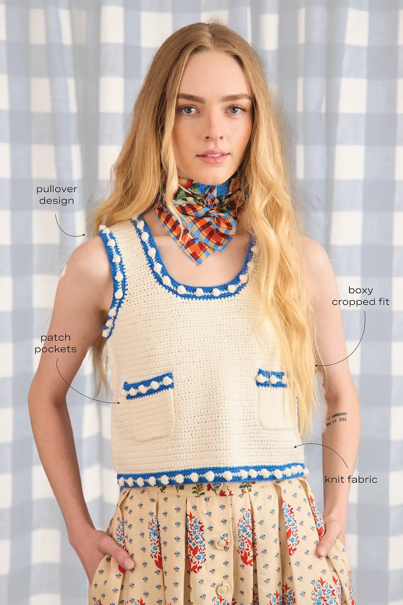 The Clover Sweater Tank is a playful yet polished knit. With its cropped, boxy fit and easy pullover design, it’s perfect for laid-back days with a touch of structure. Patch pockets add a charming, functional detail to this versatile staple. We especially love it styled with our gingham Juno Pants for a fresh, effortless look.