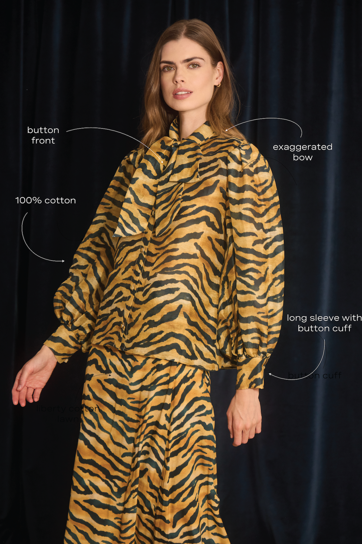 Make a statement with the Tess Blouse in linen silk Tiger print, a defining piece of the season. Featuring an elegant tie-front neckline that can be artfully styled into a bow, along with delicate shirring at both the front and back bodice, this blouse transcends the ordinary. Its sophisticated design ensures it stands out as a refined and memorable addition to your wardrobe, especially when paired with the matching Suki Skirt.