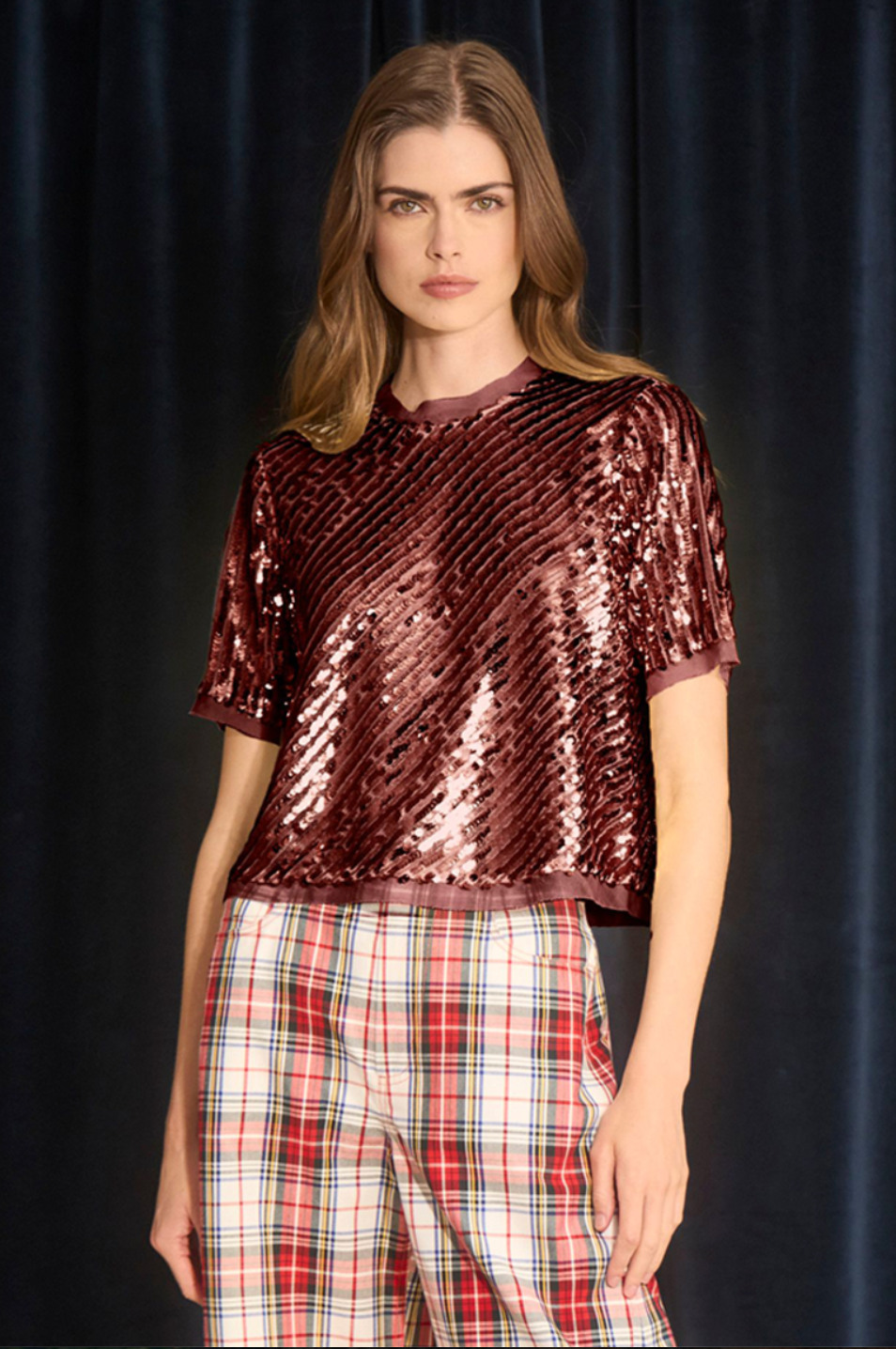 Pixie reimagines the classic T-shirt in festive shine. Drenched in mulberry sequins, this true showstopper is finished with soft chiffon trim at the neckline, sleeves, and hem—adding airy movement and a refined edge. The exquisite craftsmanship and shimmering details make the Pixie Top a dazzling addition to any wardrobe—an unforgettable piece destined to turn heads at every occasion.
