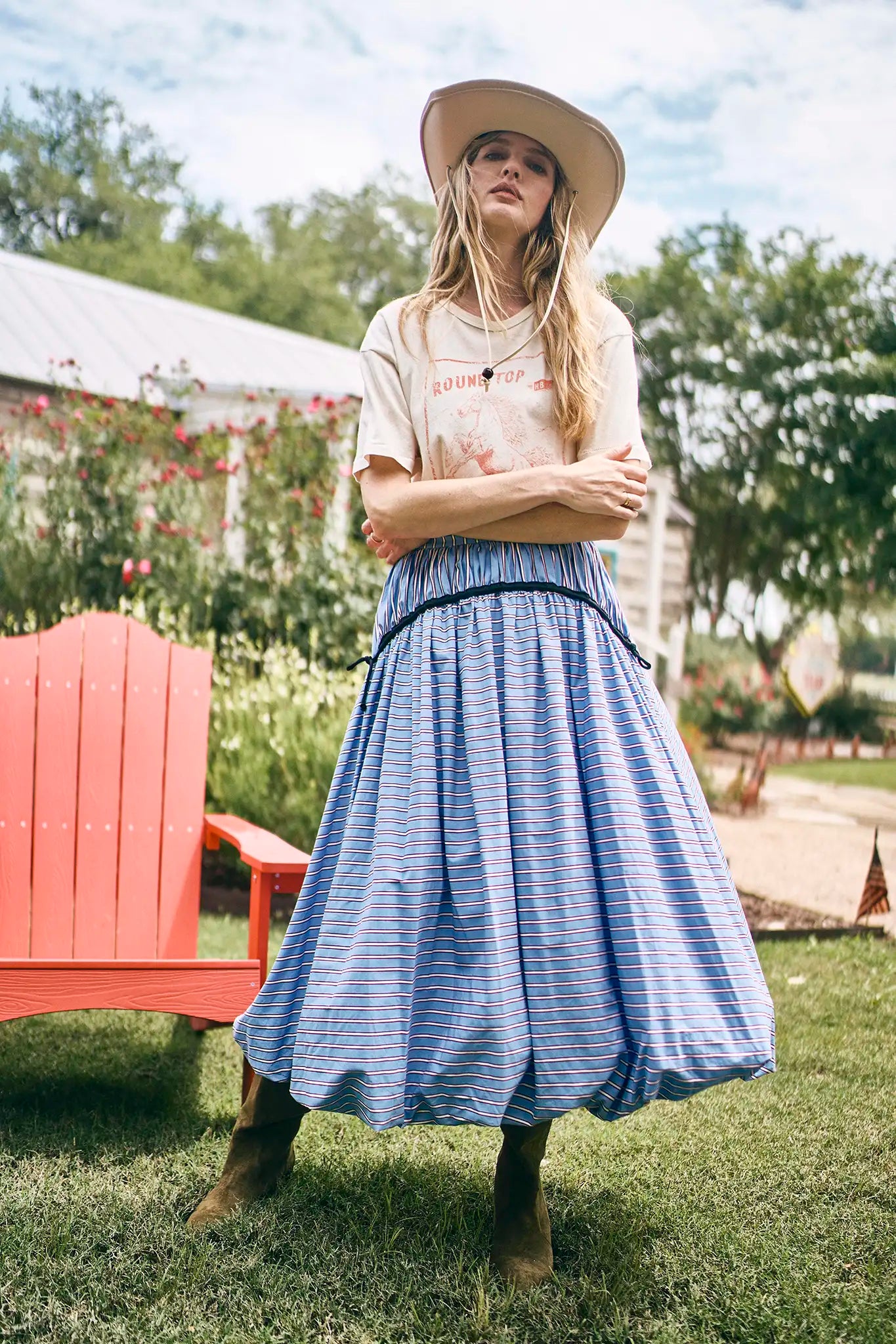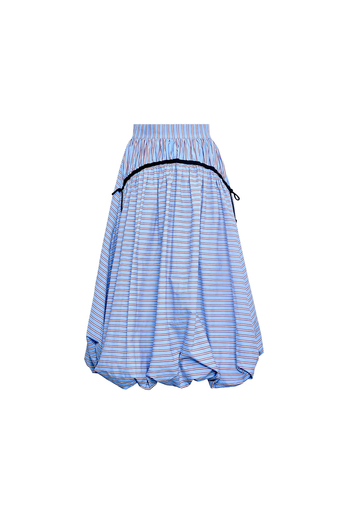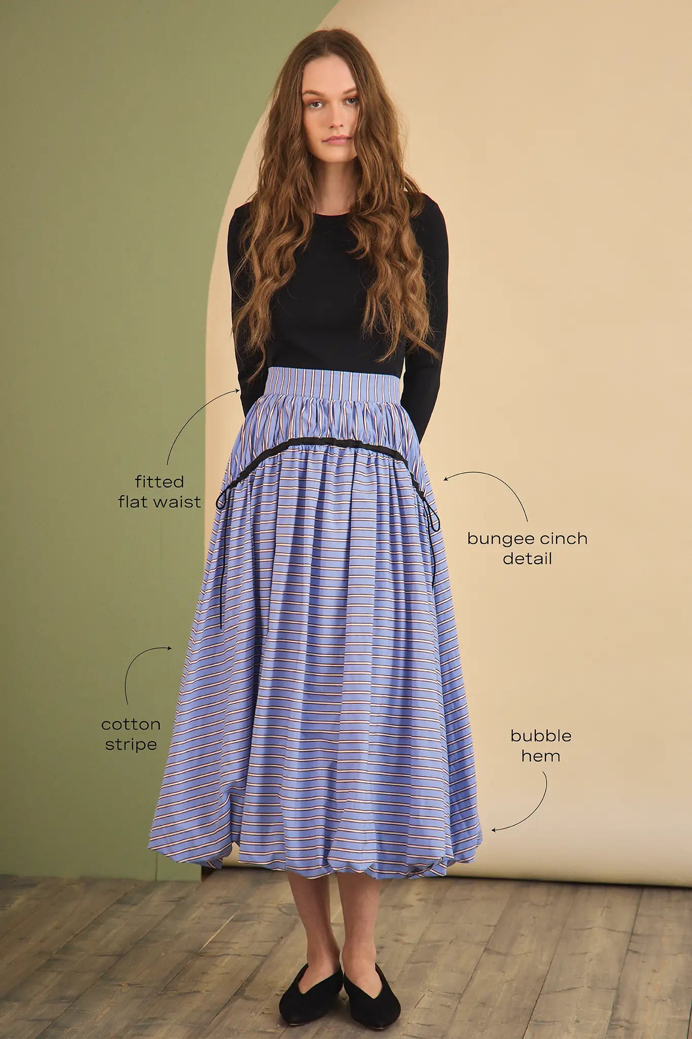 The Allegra Skirt is a bold blend of volume and sporty sophistication. Designed in crisp cotton stripe, this full bubble silhouette features a fitted flat waistband, back zipper closure, and an adjustable bungee cinch detail on the front panel for an athletic-inspired twist. With its dramatic shape and playful texture, it’s a statement piece that brings fresh energy to your fall wardrobe.