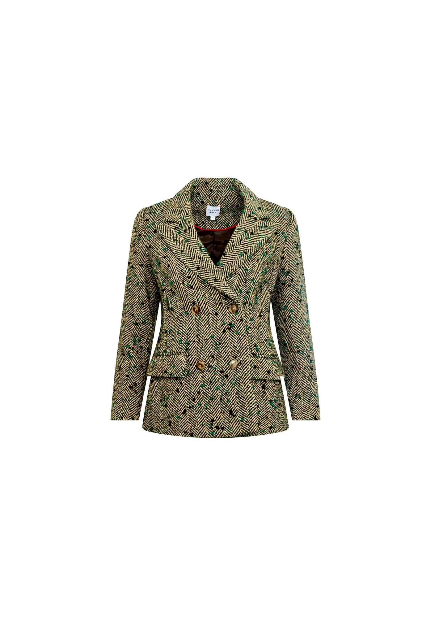 The Huntley Half Coat debuts this season in a sophisticated mixed herringbone wool blend, offering timeless polish with modern ease. Designed with a collared neck and peaked lapels, it features a double-breasted placket, flat welt chest pocket, and flap front lower pockets for classic tailoring details. With its longer coat fit (not a blazer cut), Huntley strikes the perfect balance of structure and warmth—an elevated layer that transitions seamlessly from day to night.