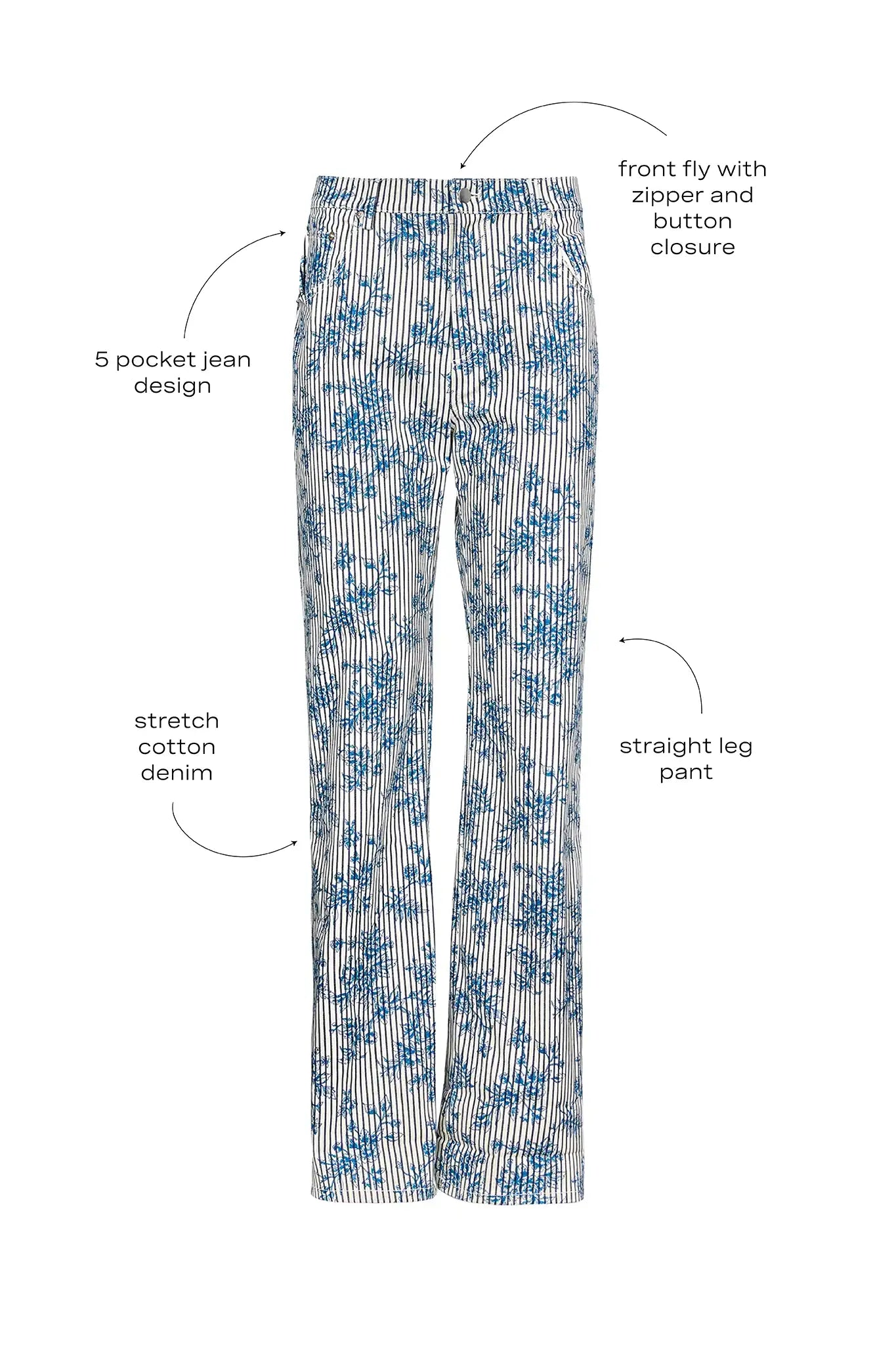 The Lakelynn Pant in Cornflower Toile brings a playful twist to a classic straight-leg denim silhouette. Crafted from stretch cotton denim for comfort and ease, it features traditional five-pocket construction and a front fly with zipper and button closure. The custom toile print adds just the right amount of charm, making it a standout staple for fall and beyond. We love it styled with our Naya Top and Barn Jacket for a coordinated head-to-toe look, or paired with the Odessa Shirt for a chic mix of denim textures and prints.