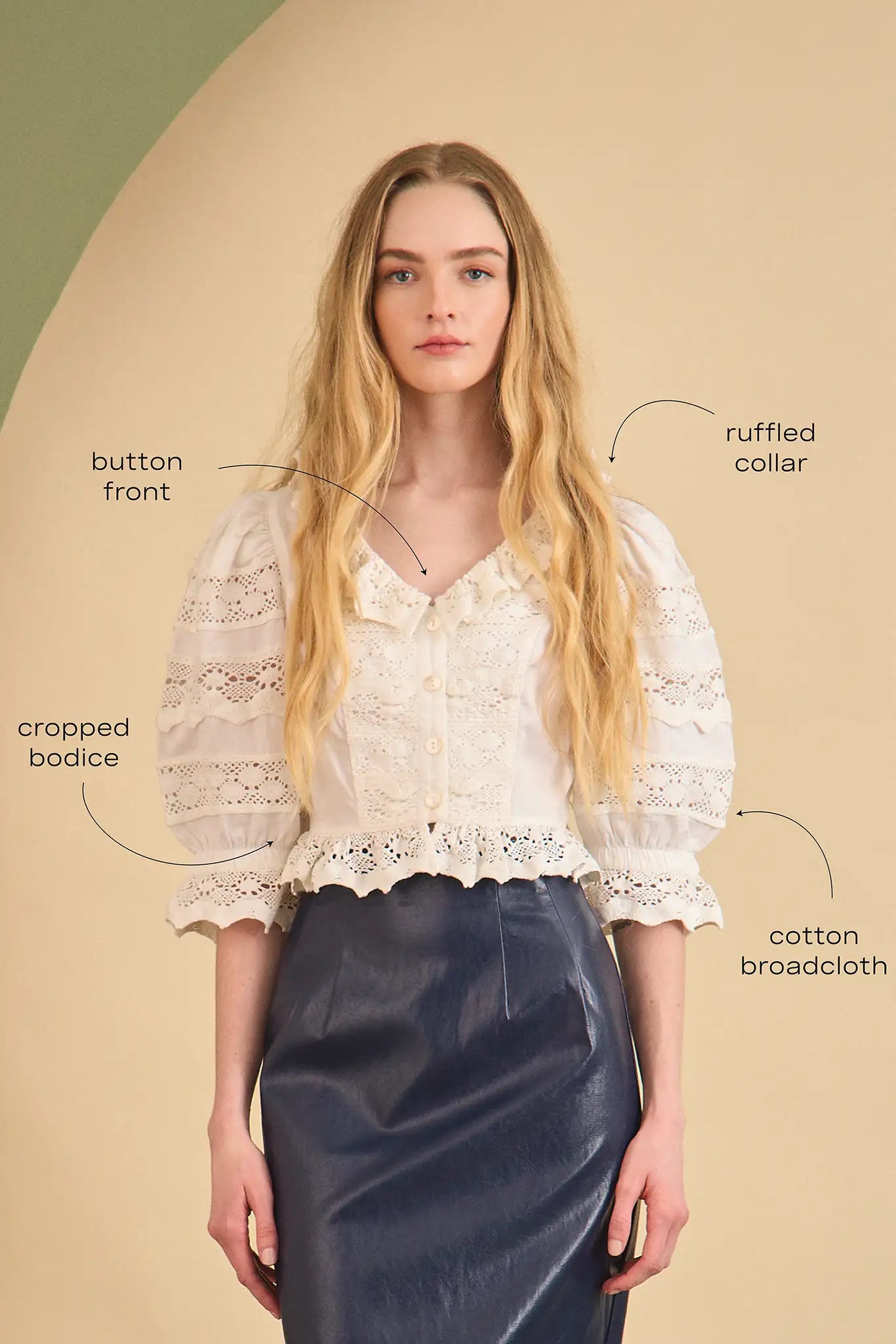 The Primrose Blouse is a romantic reimagining of the classic white blouse. A flattering V-neckline framed by a soft ruffled collar sets a feminine tone, while the cropped silhouette, button front, and elbow-length sleeves with delicate ruffle detail add to its charm. Crafted from crisp cotton broadcloth, it’s the kind of piece that feels fresh yet timeless. We love it styled with our vintage denim Mabel Pants for a relaxed, polished look or paired with the Dottie Mini Skirt for a playful, elevated set.