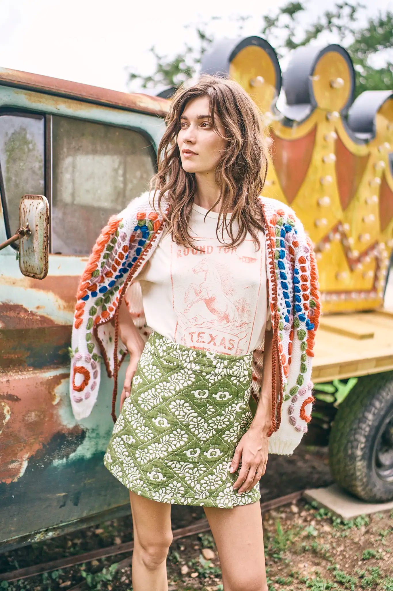 The Wyatt Cardigan is more than just a cozy layer — it’s a statement piece you’ll build outfits around all season long. Designed in a colorful, eye-catching knit, this oversized silhouette features a flattering V-neckline, long puff sleeves, and a charming tie-front closure for a feminine finish. Crafted from a soft acrylic-wool blend, Wyatt offers both warmth and impact, making it a true hero in your wardrobe. We love it layered over the Callie Sweater for a textured, tonal look or paired with our Round Top Tee for a playful mix.