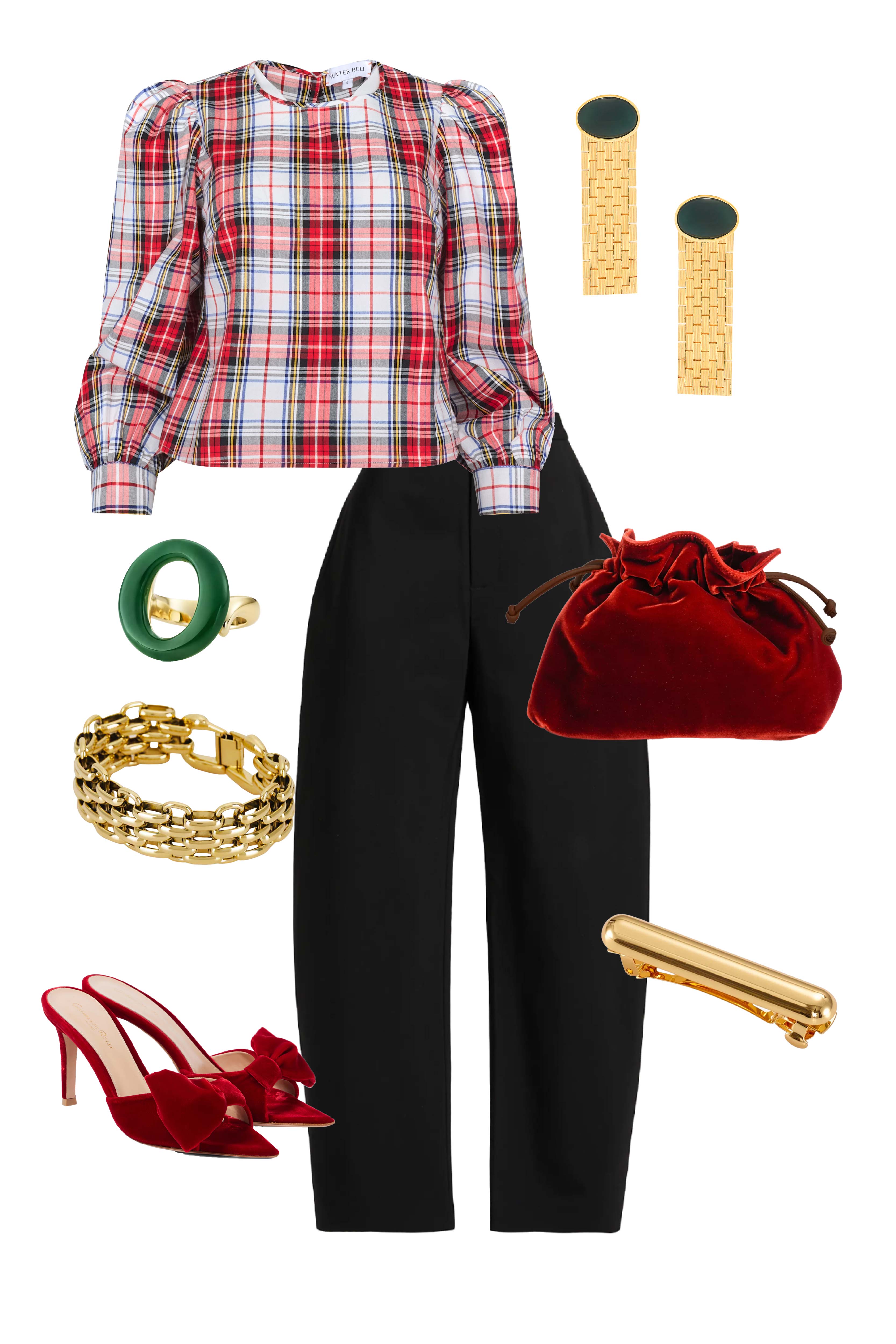 The Lottie Top is a refined take on a classic silhouette, reimagined in our signature Carlyle Plaid. Designed with a crew neckline and finished at the back with contrast black velvet ribbon ties, it brings a touch of romance to a timeless shape. Full balloon sleeves taper into tailored cuffs, striking the perfect balance of soft volume and polished structure. A versatile piece for the season, Lottie pairs beautifully with the Ida Skirt for a sleek finish or with the Dominic Skirt for a bold plaid statement.