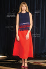The Astor Top in Midnight Wool is a refined statement piece with artisanal detail. Crafted from Italian wool, it is accented with cutout trim, contrast embroidery, and a touch of fringe that adds subtle texture. Designed with a crew neckline, invisible zipper closure, and sleeveless silhouette, it delivers a look that is polished yet playful. Style it with the Rivington Skirt for a striking matching set or pair it with winter white pants for a modern take on holiday dressing. Proudly made in NYC.