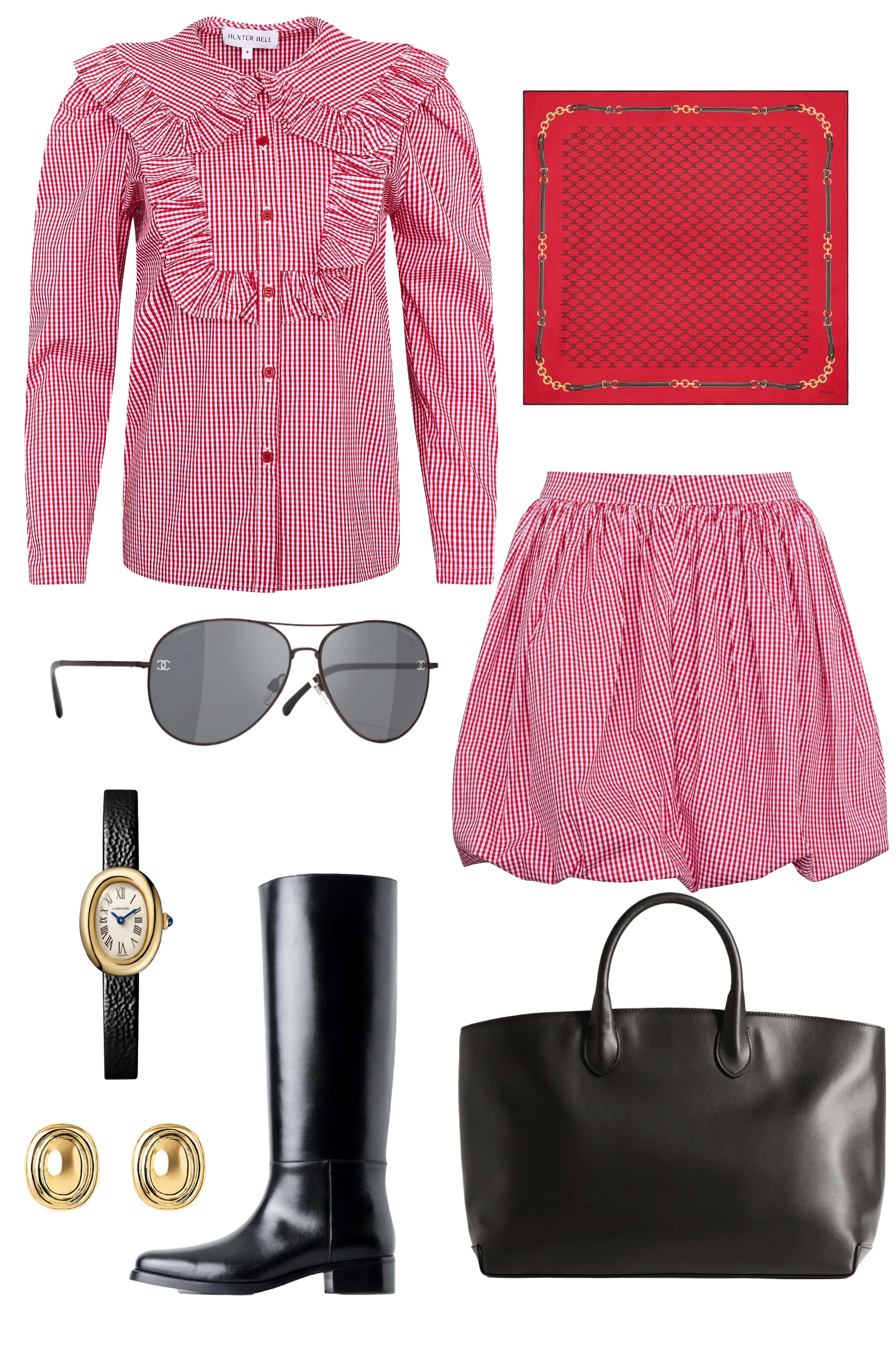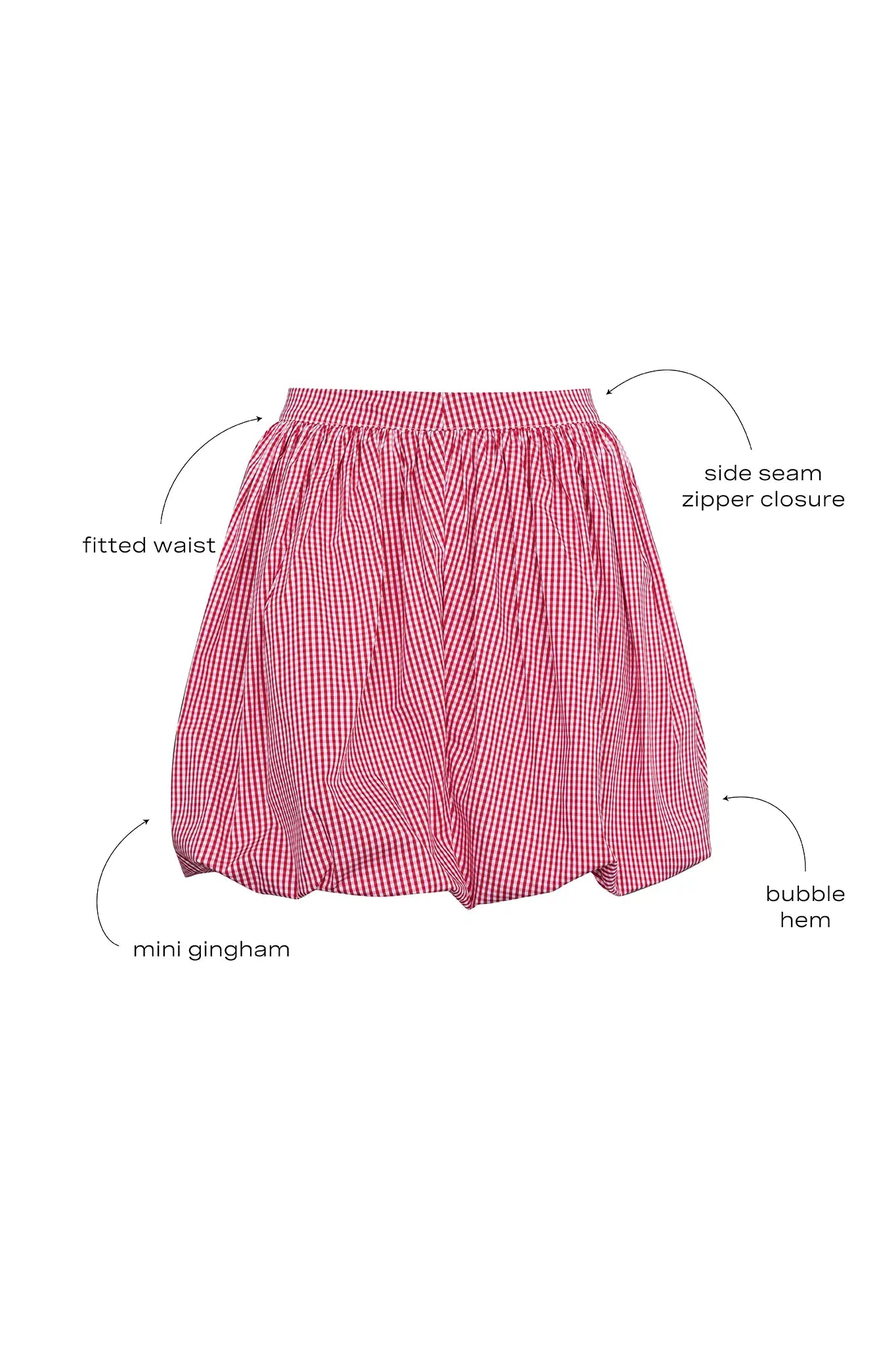 The Kinsley Skirt is a flirty bubble mini in our Carmine Check, a classic gingham updated with a modern twist and a touch of stretch for a smooth, comfortable fit. A trim traced fitted waist defines the silhouette, while the bubble hem creates playful volume and movement. Effortless and fun yet undeniably polished, Kinsley is a statement piece that captures the Hunter Bell spirit. Style it with the Mae Top for a coordinated set or pair it with the Doering Top in bright white for an instant pop of holiday contrast.
