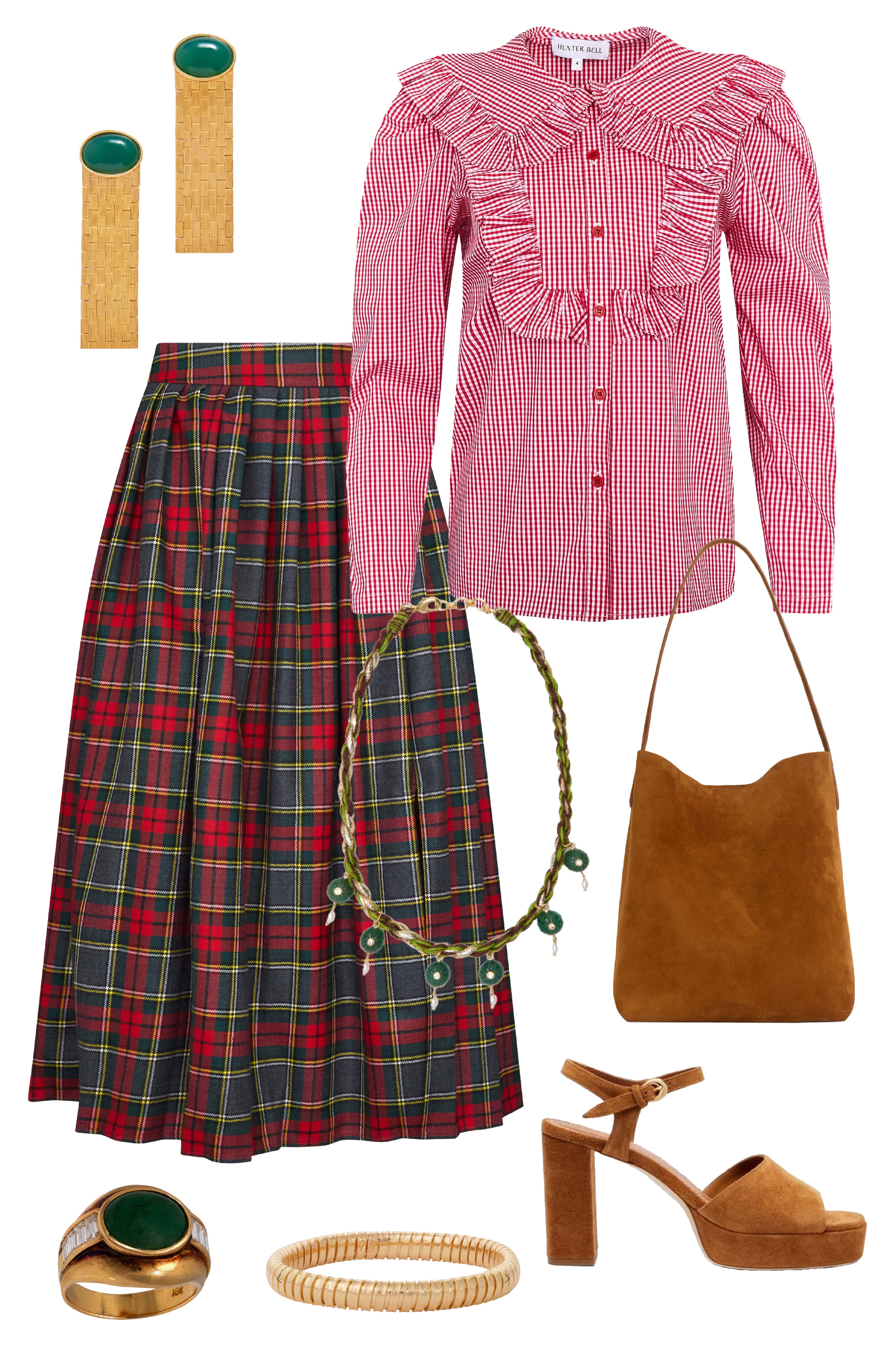 The Mae Top introduces a fresh silhouette to the Hunter Bell collection. Rendered in our Carmine Check, this reimagined gingham top features a collared button front shape, ruffled yokes at both the front and back, and voluminous long sleeves finished with button cuffs. Feminine yet tailored, Mae offers a playful balance of charm and polish. Pair it with the Kinsley Bubble Skirt for a coordinated set that feels festive, modern, and unmistakably Hunter Bell.