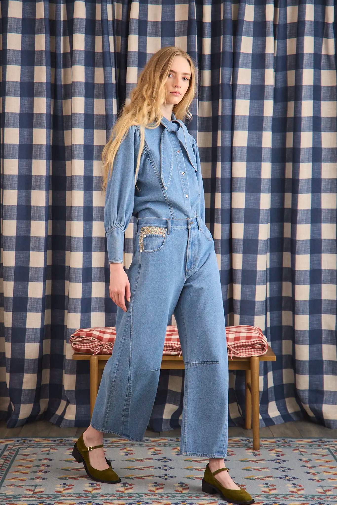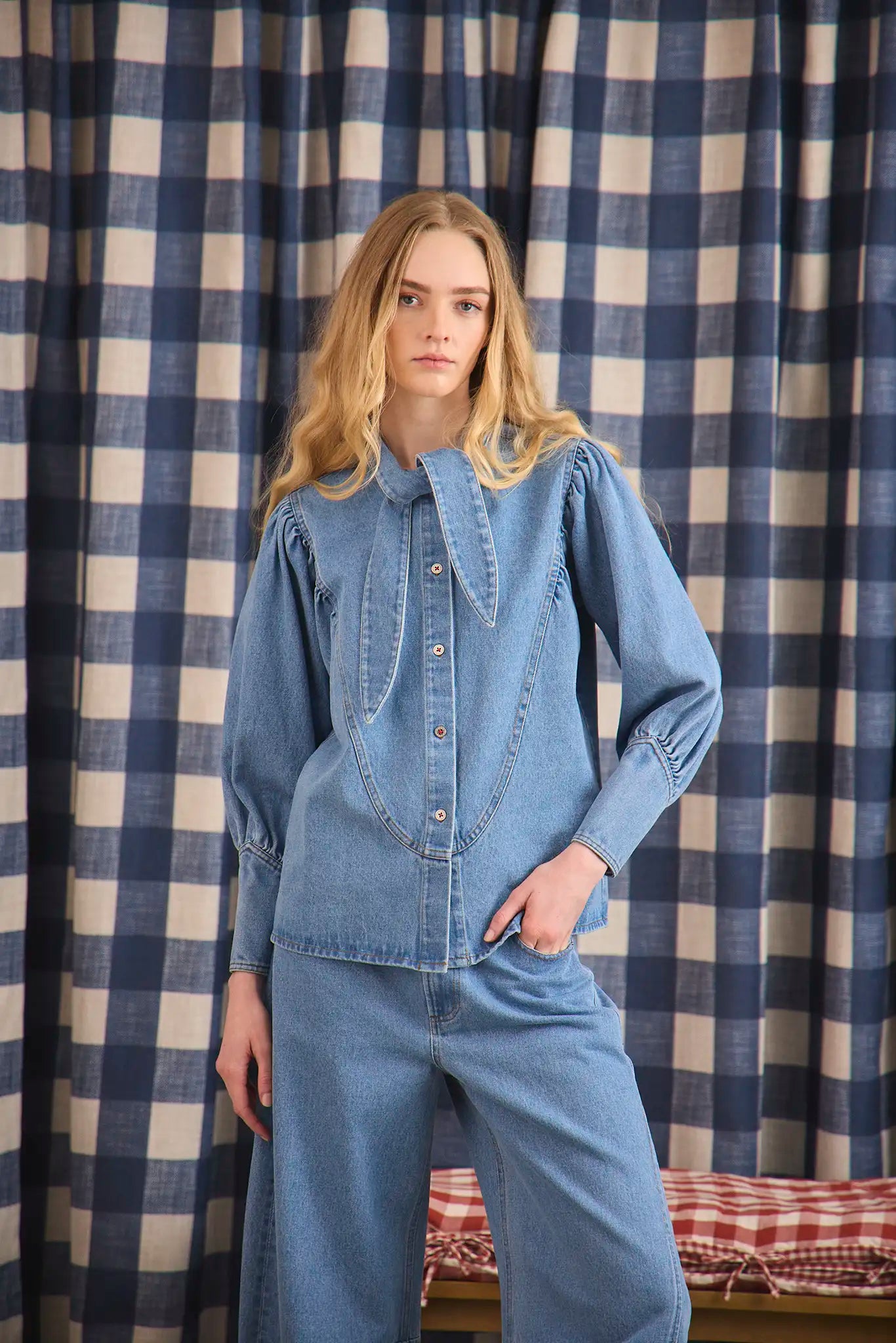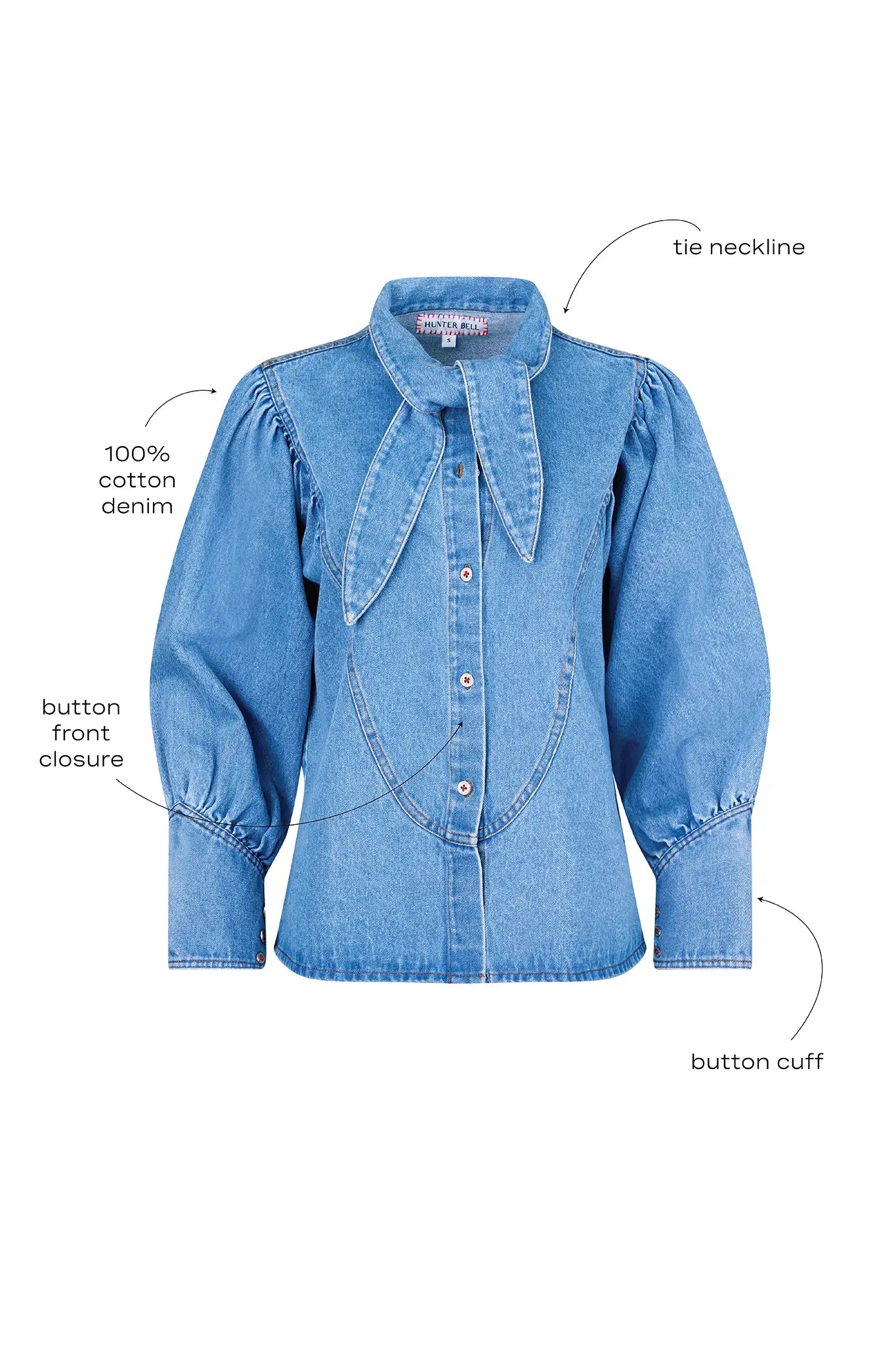The Odessa Shirt in vintage denim blends classic Western influences with a distinctly feminine touch. Designed with a bold tie neckline, statement curved front yoke, and puffed long sleeves with button cuffs, it strikes the perfect balance of structure and softness. Crafted from 100% cotton denim with traditional seaming and a polished button-front closure, it’s a versatile piece that feels both timeless and modern. We love it styled with the matching vintage denim Mabel Pants for a head-to-toe look or paired with the Lakelynn Pant for an effortlessly elevated pairing.