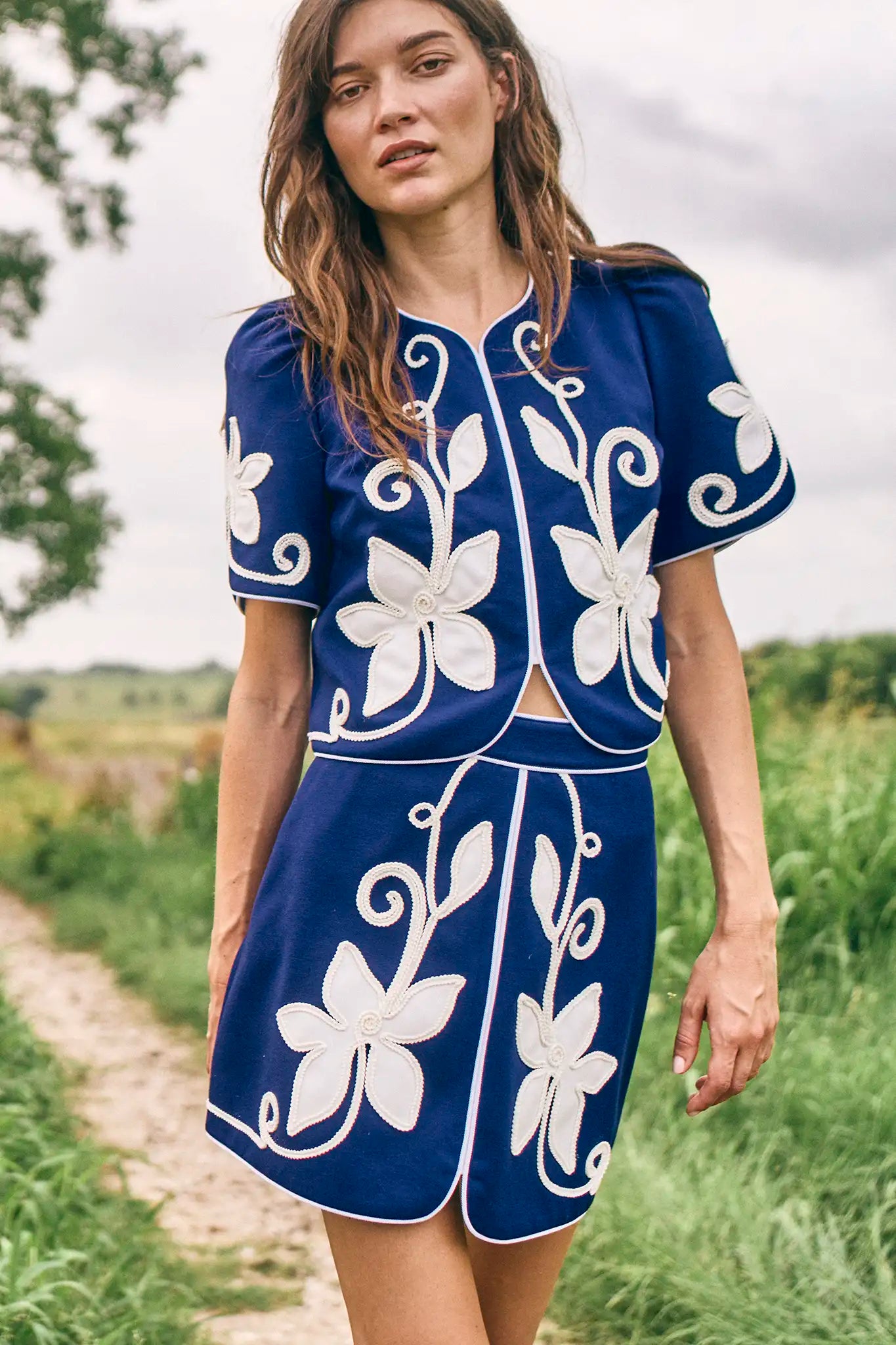 Designed as the perfect match to the Beeson Top, the Dottie Mini Skirt brings vintage-inspired whimsy to a modern silhouette. Featuring a flattering A-line shape, fitted waist, and back zipper closure, this style is all about charm and ease. The tulip hem adds a soft, feminine touch, while delicate appliqué detailing speaks to the thoughtful craftsmanship we're known for. Wear it as a set with the Beeson Top or with your favorite top for a playful twist.