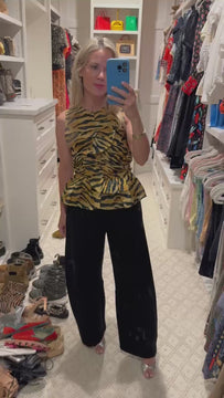 The Doering Top in Linen Silk Tiger Print is a striking new silhouette for the season and a hero piece in the holiday collection. Designed with architectural precision and feminine charm, it features a fitted V-neckline, cascading ruffles, flattering shirring, and a peplum waist that delivers a sculptural finish. Crafted in a bold yet wearable print, this sleeveless style balances artistry with versatility, making it a top that truly transforms any look. Offered in multiple color ways this holiday season, the Doering is destined to become a signature style. Pair it with the matching Suki Skirt for a coordinated set or with the Duvall Pant in black for a sleek contrast.