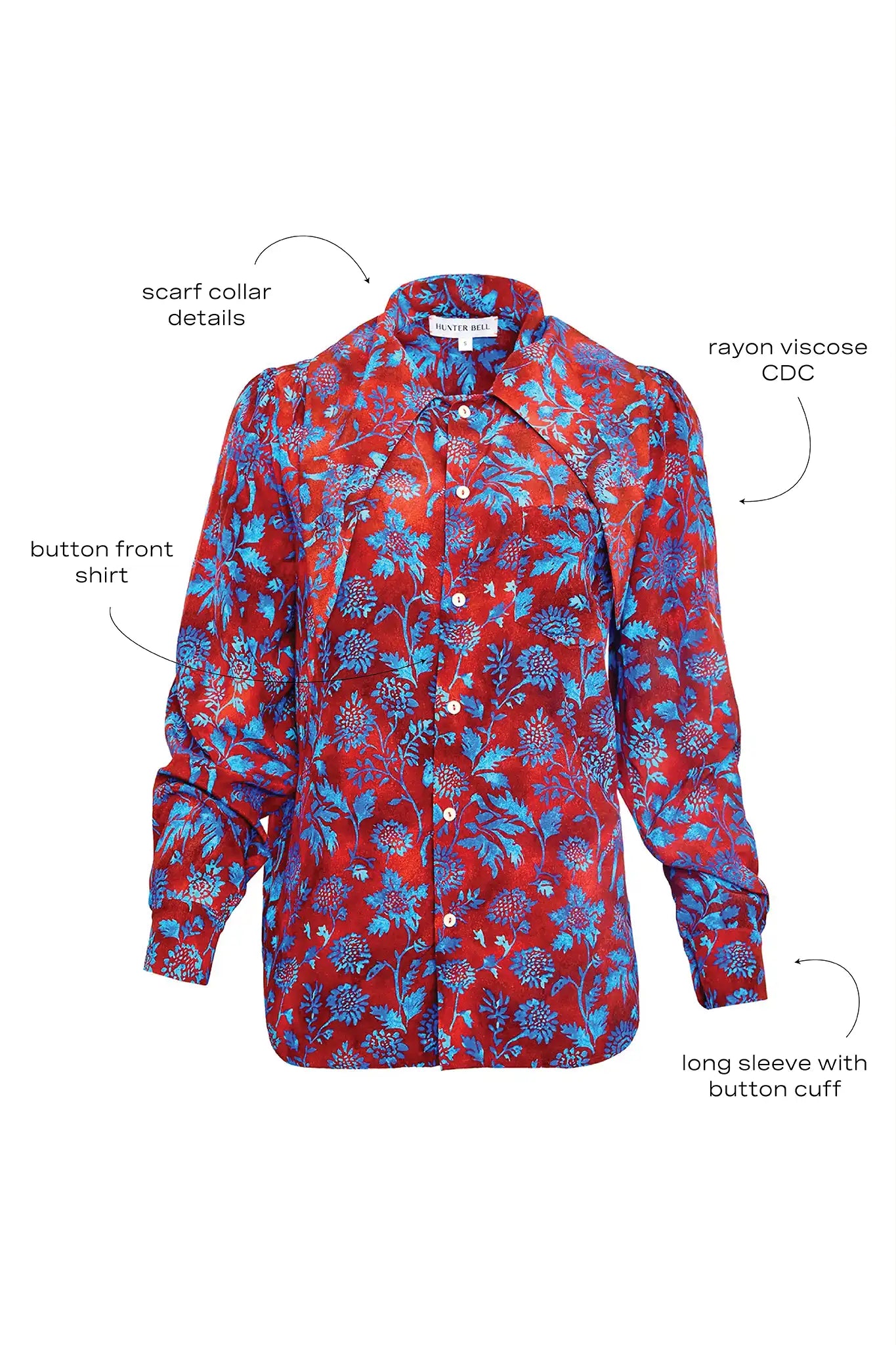 The Frances Top in Crimson Canyon offers a refined twist on a classic button-up. Designed with a tailored fit, it features a button front, long sleeves with button cuffs, and an elegant scarf collar detail that adds a touch of feminine sophistication. Whether tied in a bow or left loose, the scarf neckline brings versatility and charm to this richly colored favorite. We especially love it paired with our vegan leather Mabel Pants for a bold, feminine look.