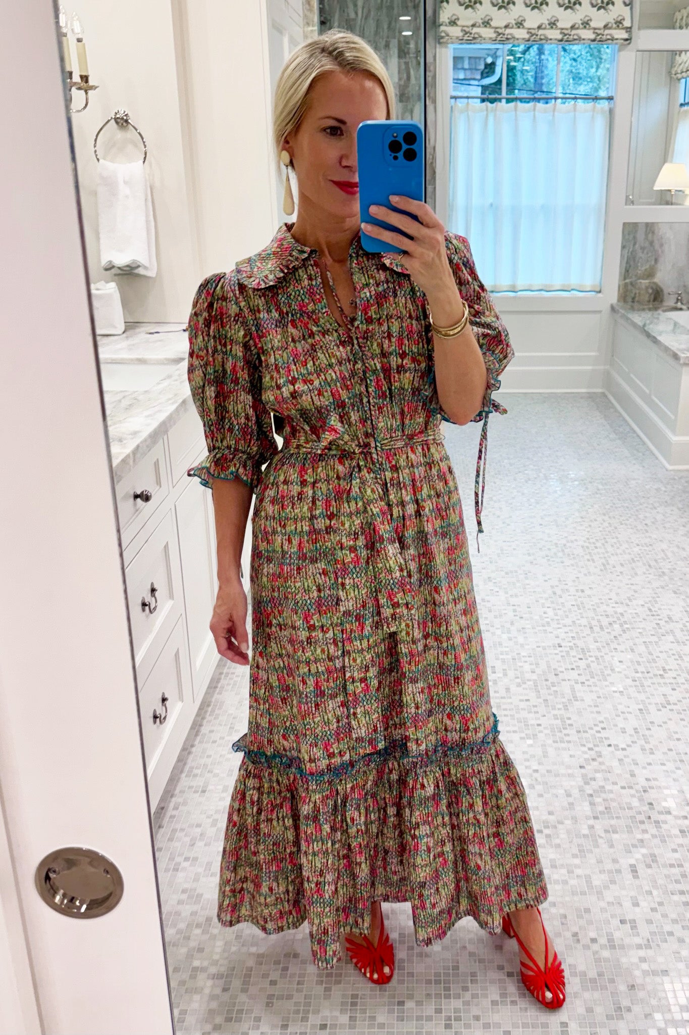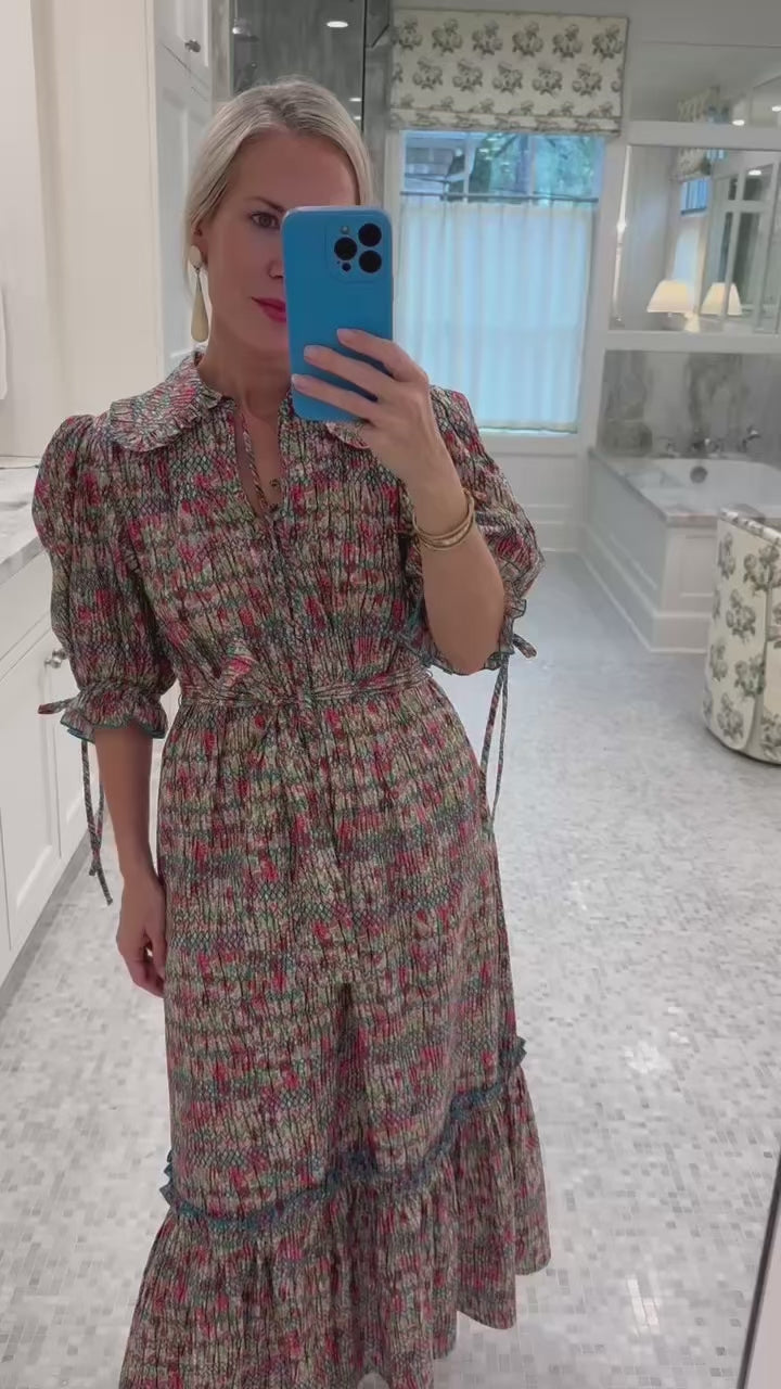 This is the Theresa Dress in an XS. The reason its not the Matthews or one name you already know is because we took some volume out. It's super flattering in this fantastic spring liberty print.