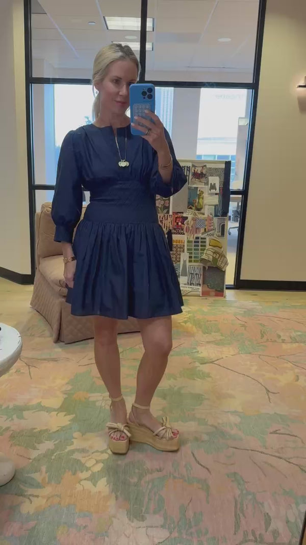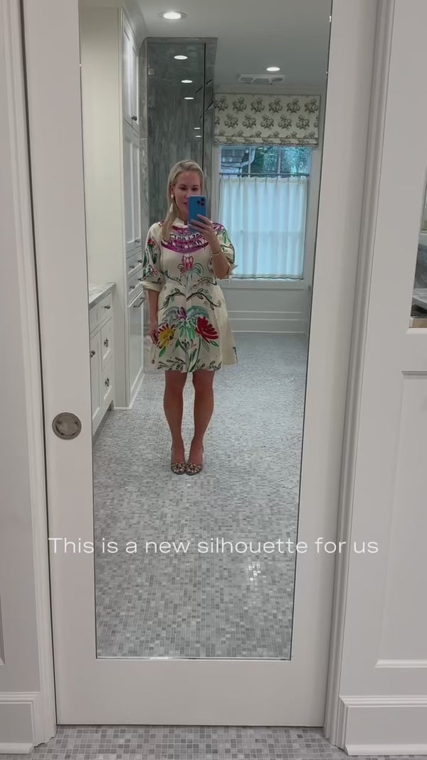 This is the Molly Dress, it's a new silhouette for us in our anniversary print. It's a really cute mini dress. She's very fun and easy with a simple button down. I'm in a size 0, but I'd probably go up to a size 2 just to have a little bit more room.