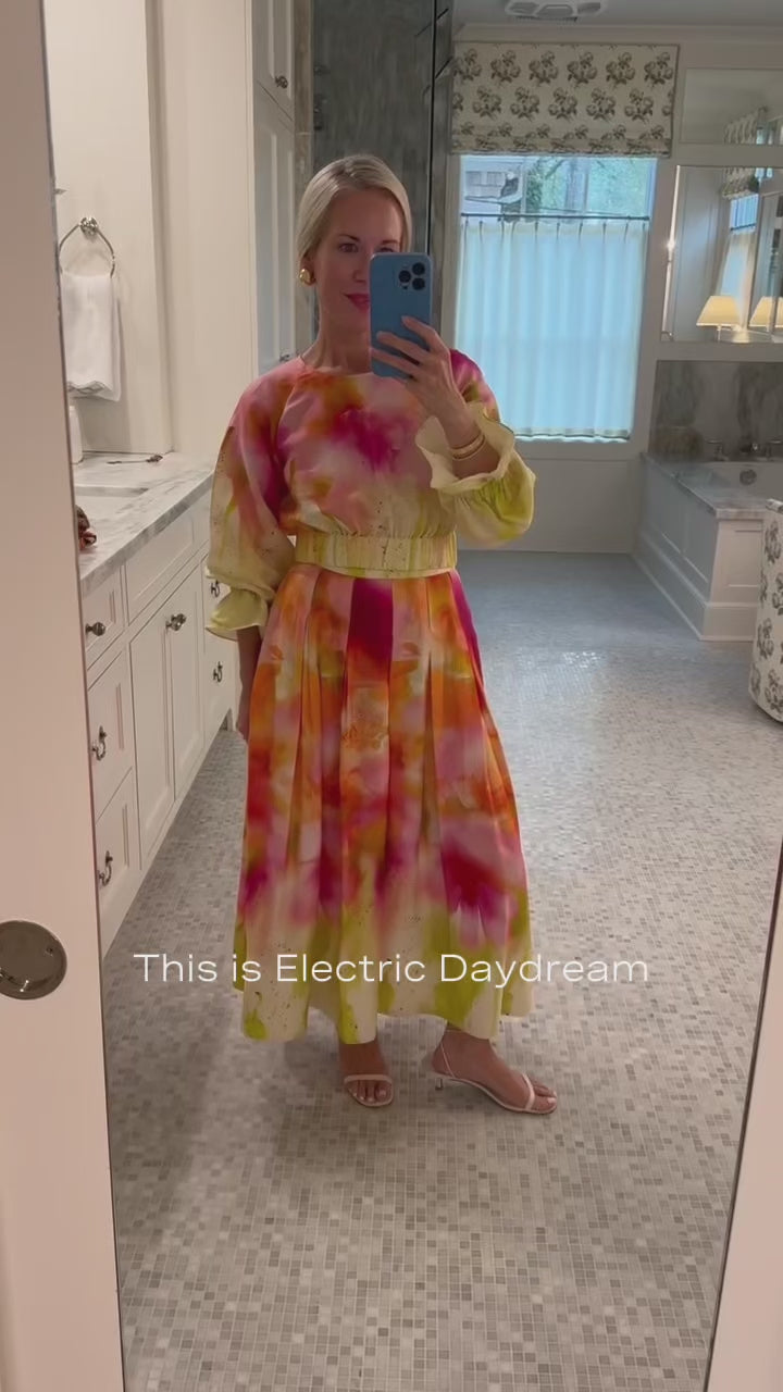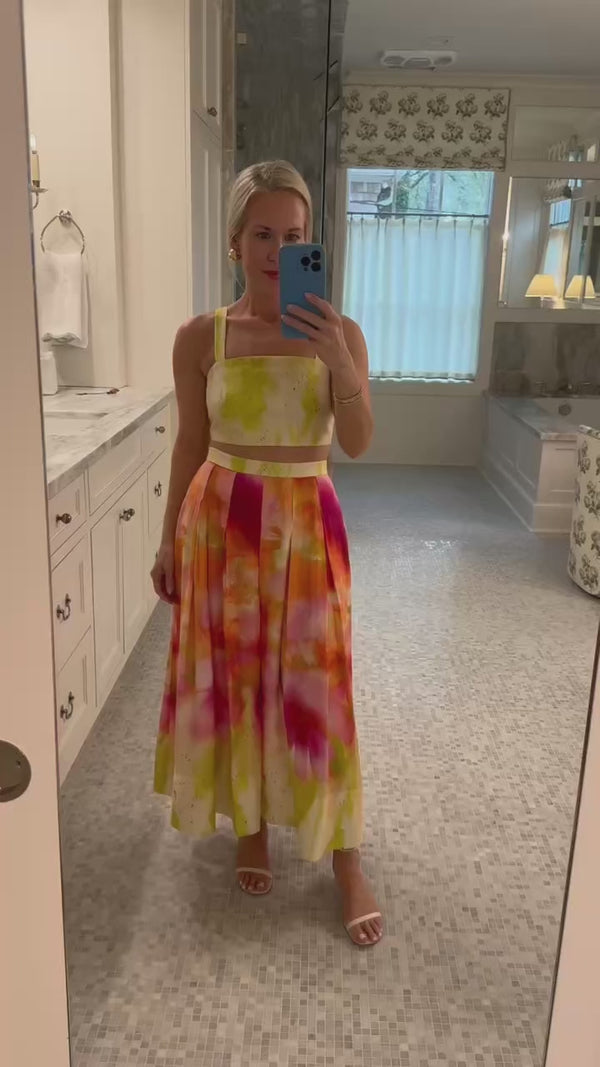Okay I'm obsessed with the Lee Top in the neon Yellow paired back to the Alexis Skirt in electric daydream. More color please! We are celebrating 20 years and we are dreaming in color. I'm in an XS in the top but would size up to a small and a 2 in the skirt.
