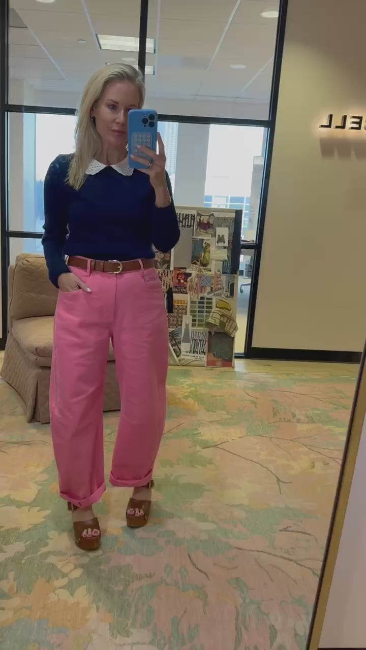 The Mabel Pant is back in this amazing pink color. It's such a fun pop right now that can transition into the spring. I have on the size 2 and rolled the hem. I paired it back to the James Shirt in an XS which is so adorable with this little scalloped edge in the light blue gingham and the Violette Sweater draped over.