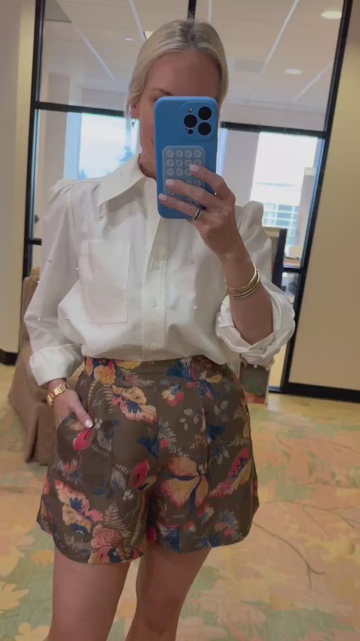 This the Ashton Short in this perfect floral print. I'm in a size 2, but I could go up to a size 4. I paired it with the Jade Shirt in an XS, a bestseller from our last resort collection. We brought it back in this white linen cotton with little pearls. Perfect for holiday and resort!