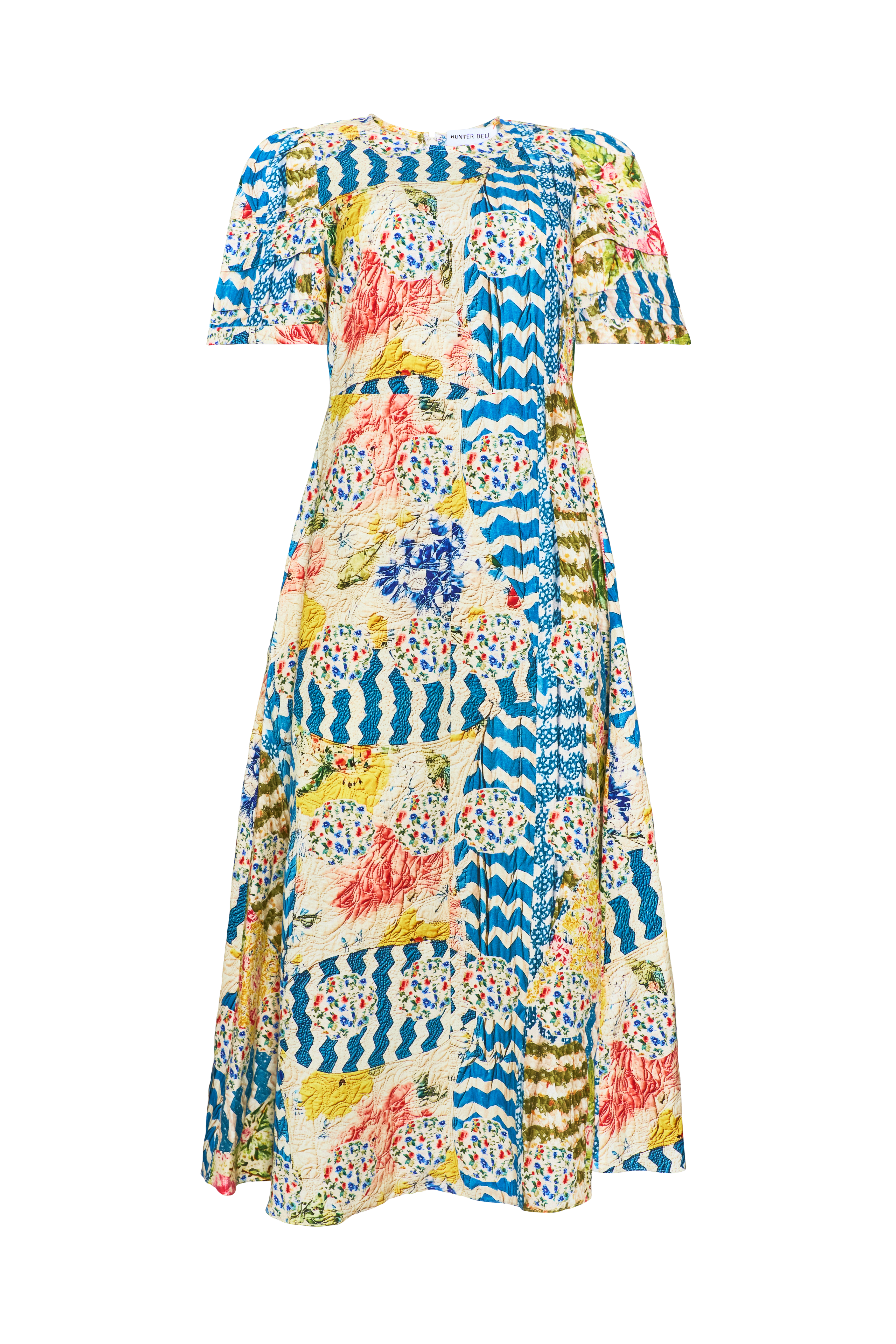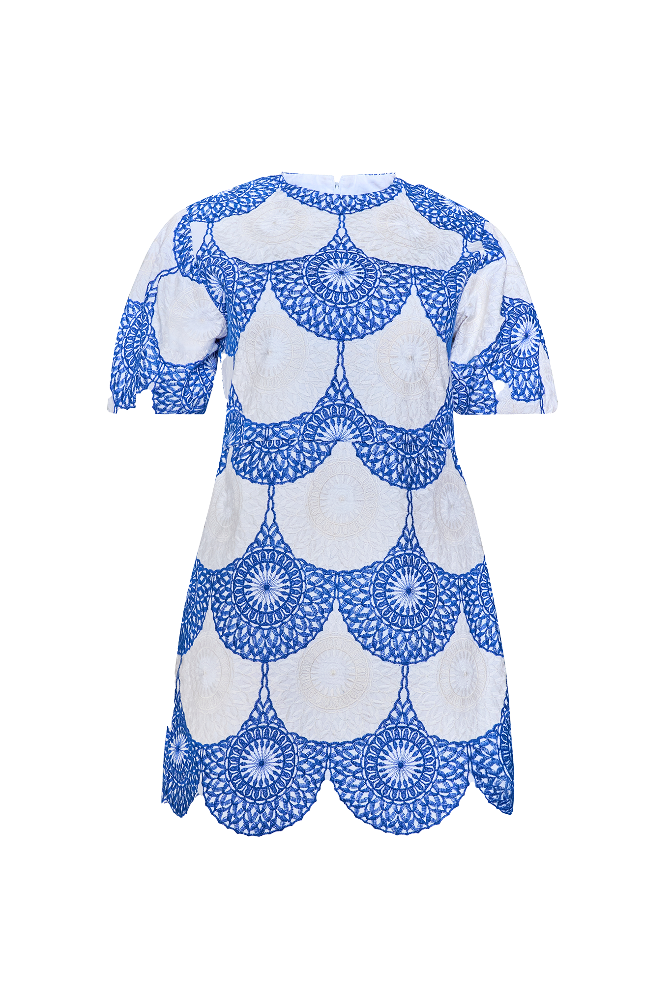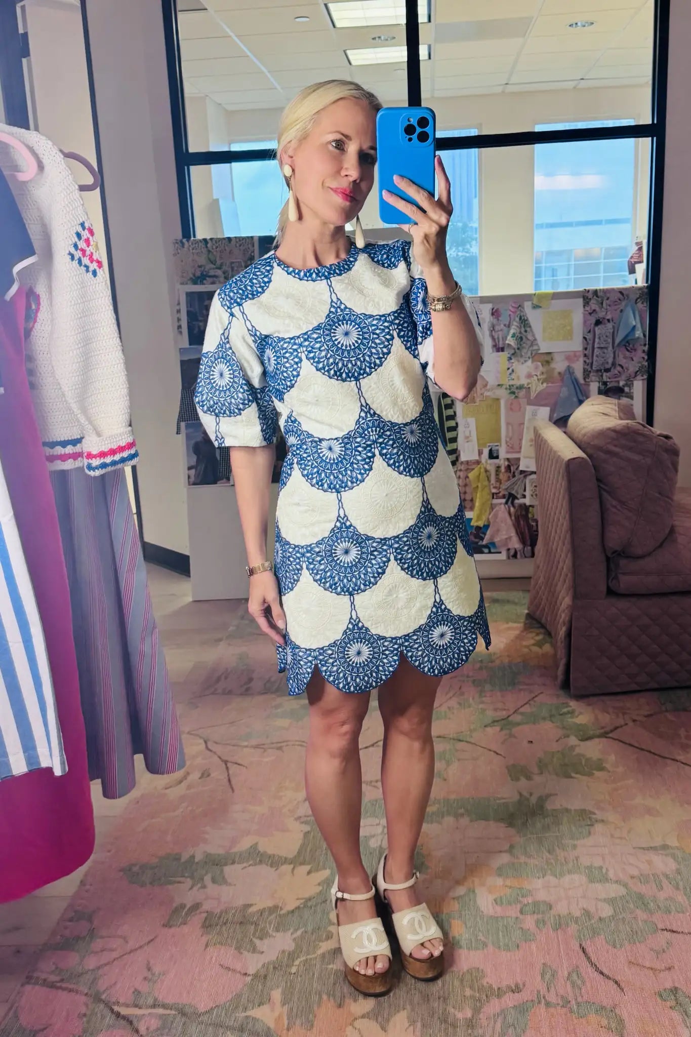 This is the Harmony. It's a new shape for us and I just love this fabric. It's so beautiful with all of this embroidery. Great sleeve shape, fitted waist and hits above the knee. I'm wearing a size 4.