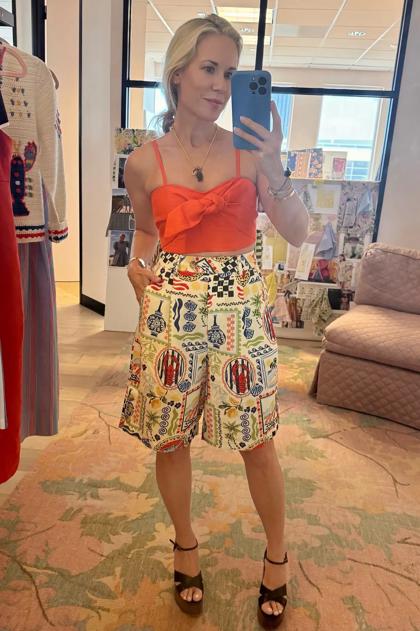 How cute is this Pearl Top! It's in that orangey red we call Tangerine Tango. I paired them with these fabulous Ginny Bermuda Shorts. Bermuda Shorts are having a moment and I think we nailed it. Wearing a size 2 in both the shorts and top.