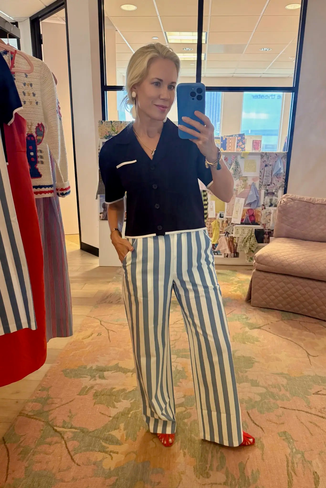 This is the outfit you're gonna see me living in. I love the Juno Pant in this very bold blue and white stripe. I'm in a size 2 and I love how high waisted these are. They have a double button, a side pocket and are super comfortable. I paired it with the super stretchy Banff Top. I sized up to S instead of XS.