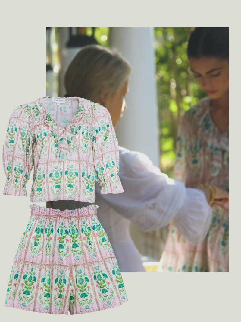 Inspired by the orderly geometry of herb gardens and trellised vines, this spring reinterpretation of our Fall ’24 Trellis Print captures a sense of fresh optimism. Subtly distressed borders add texture, while the two color ways—serene green and delicate pink—evoke joyful outdoor lunches and sunset dinners on vacation.
