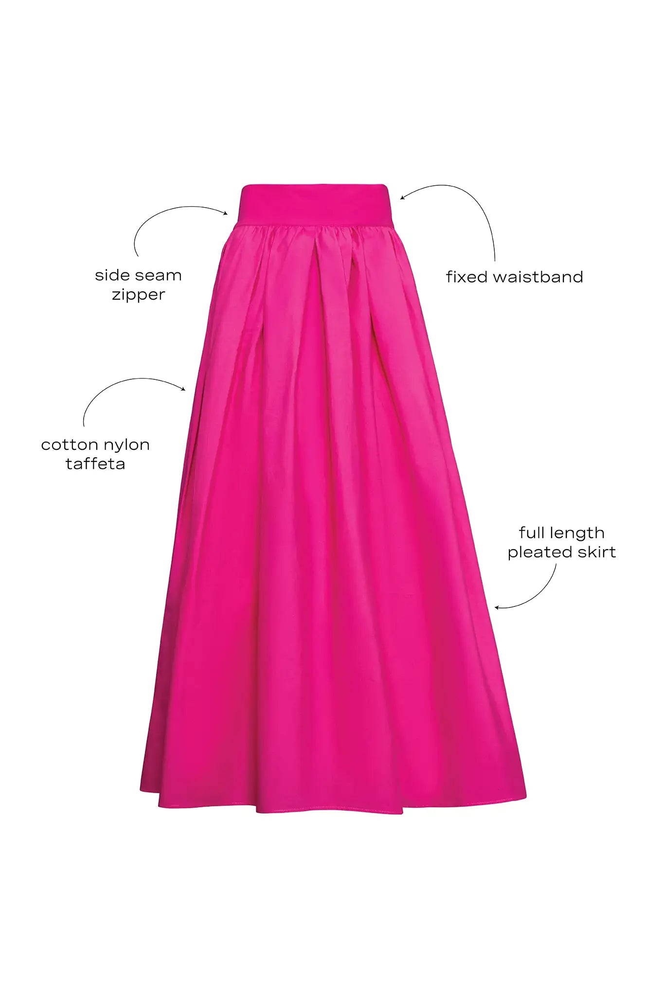 Introducing the Avenue Skirt, a full-length pleated silhouette crafted in vibrant fuchsia stretch taffeta. Designed with a fixed waistband, side-seam zipper, and functional pockets, this sweeping style makes a striking statement. A bold anchor piece for your spring wardrobe, Avenue brings instant drama and undeniable polish.
