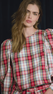The Lottie Top is a refined take on a classic silhouette, reimagined in our signature Carlyle Plaid. Designed with a crew neckline and finished at the back with contrast black velvet ribbon ties, it brings a touch of romance to a timeless shape. Full balloon sleeves taper into tailored cuffs, striking the perfect balance of soft volume and polished structure. A versatile piece for the season, Lottie pairs beautifully with the Ida Skirt for a sleek finish or with the Dominic Skirt for a bold plaid statement.