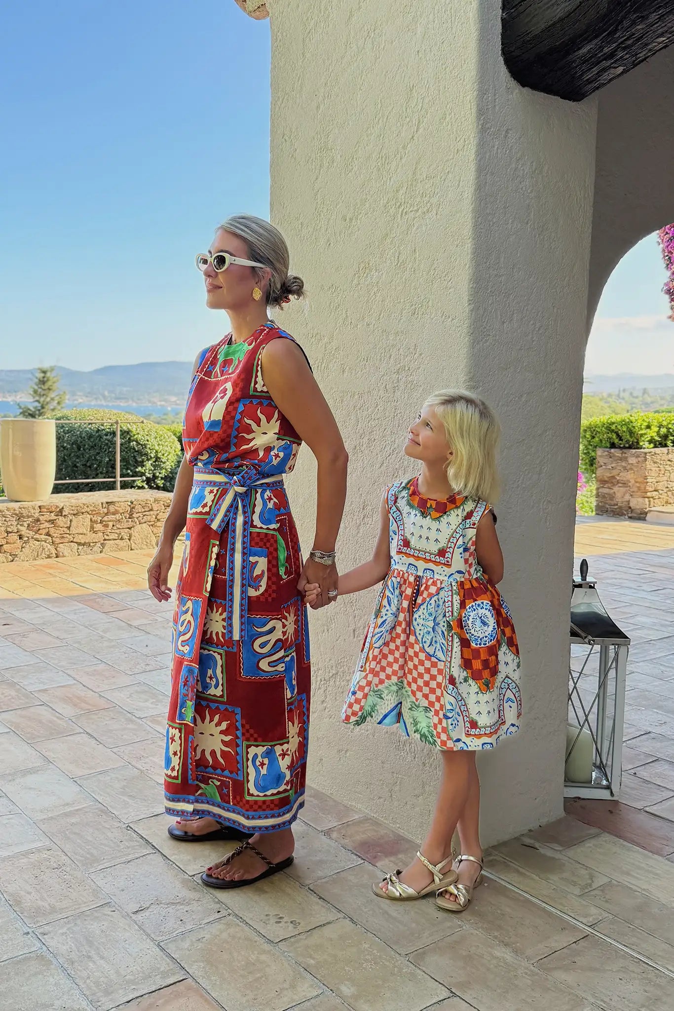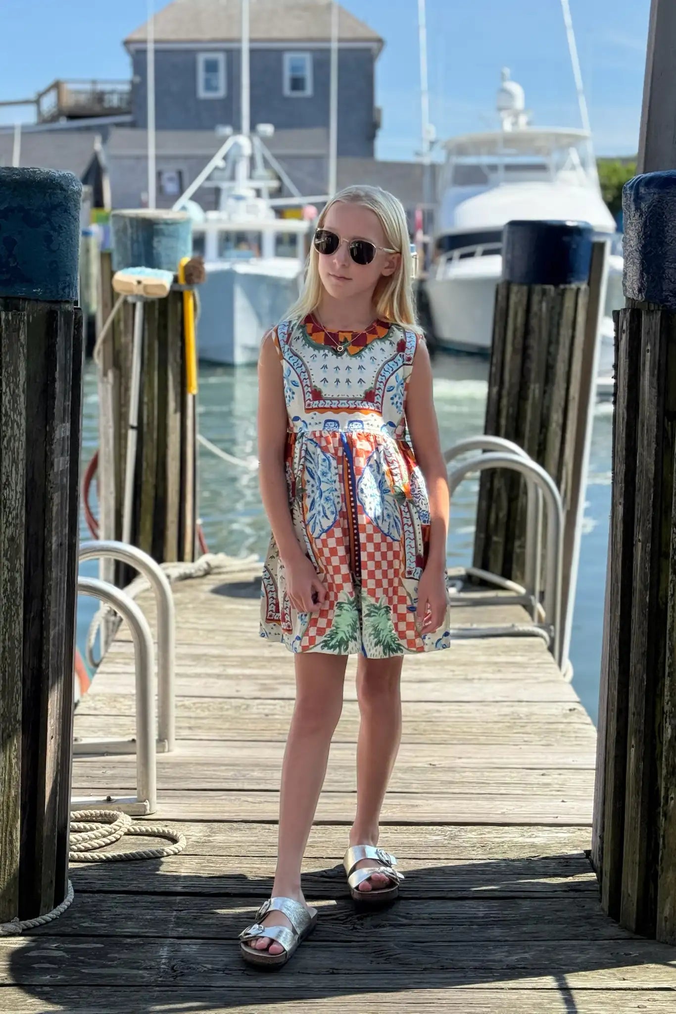 The Piper Dress is back in our charming Sundance Tile print, bringing playful polish to your little one’s wardrobe. This fit-and-flare style features a classic crew neckline, back button closure, and a full, knee-length skirt made for twirling. It coordinates perfectly with our women’s Nicole Dress, Yvette Dress, Brookie Top, and Eva Skirt for a sweet Mommy and Me moment that’s full of color and charm.