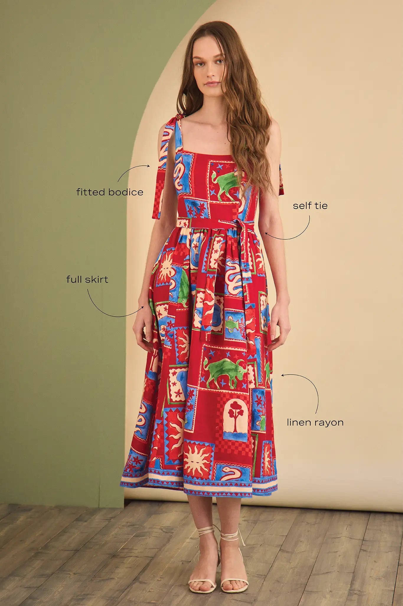 The Quincy Dress in our vibrant Sante Fe print is a bold, feminine piece made for the transition from summer to early fall. Featuring self-tie shoulder straps and a flattering fitted bodice, it falls into a graceful skirt that moves with ease. Crafted from a breathable linen blend, its rich colors and soft structure make it a standout piece.
