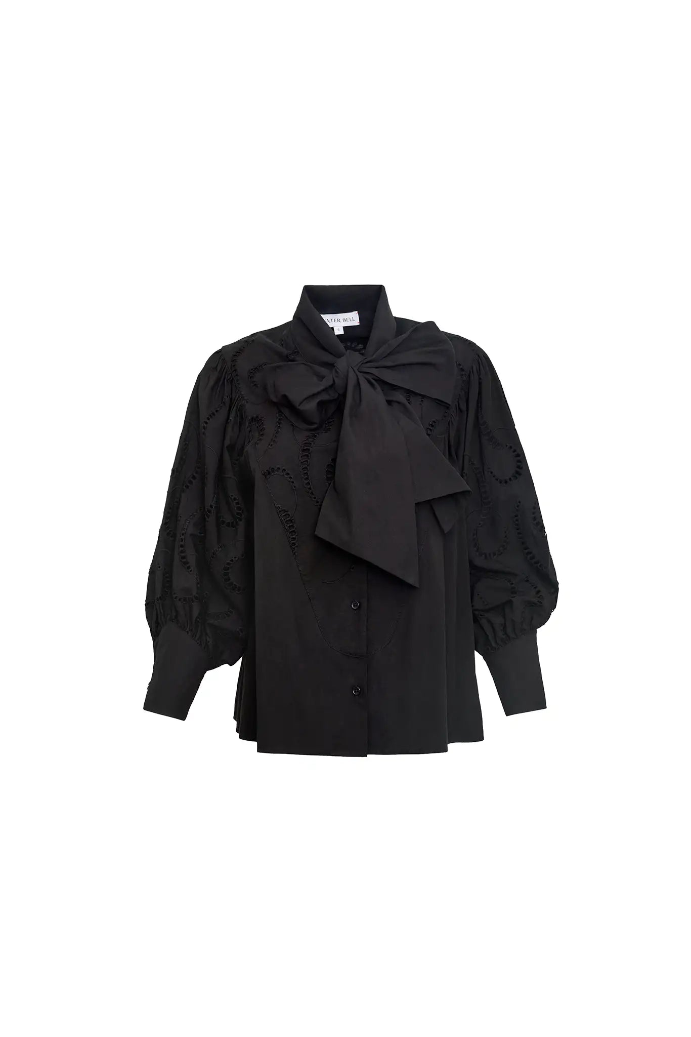 The Shay Blouse returns this season in black embroidered eyelet, offering a fresh take on a beloved silhouette. Designed with a dramatic tie-front neckline that beautifully frames the face, this blouse makes a bold yet elegant statement. Long, full sleeves finished with angled button cuffs add sophistication, while the oversized fit brings ease and versatility to styling. We love it paired with the Meeghan Skirt or Powell Skirt for a look that’s equal parts polished and playful.